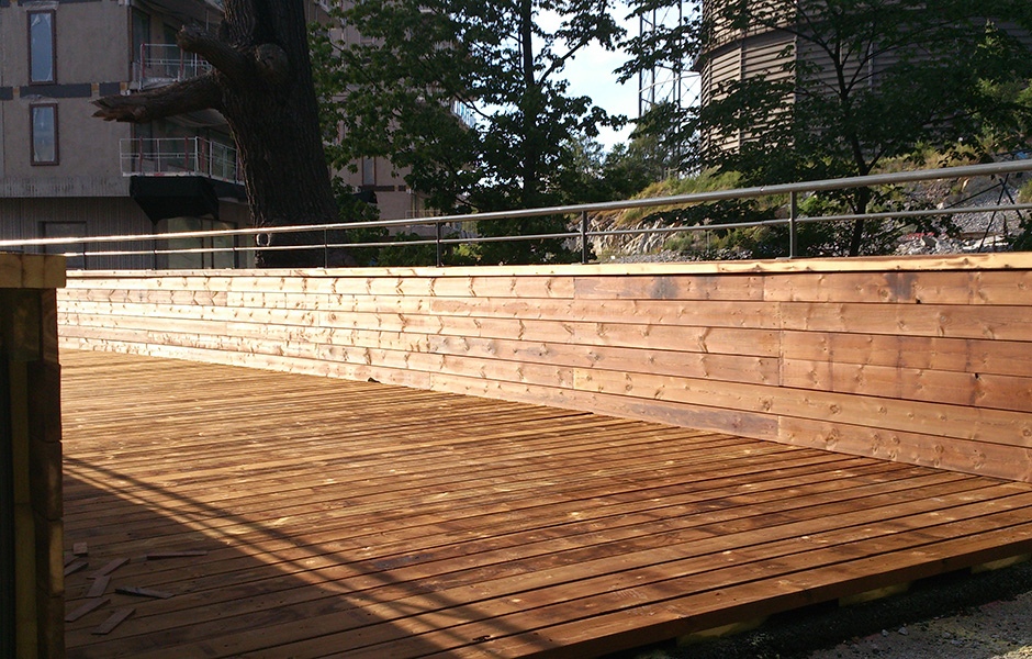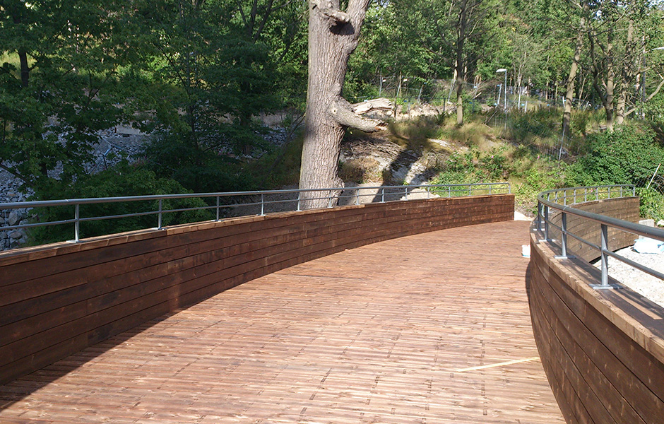 Med en dos nytänkande, slanka balkar och dubbel limning kunde den svänga förbi trädet. Sedan juni 2014 finns den trettio meter långa gång- och cykelbron. Den är utformad av en arkitektritad platta som i sin tur består av åtta block. Varje block består av elva limträbalkar av gran där varje balk är 45 millimeter bred. Plattan är ritad av arkitekt Gösta Olsson på Exploateringskontoret. Panelen och slitplanken är av kärnfuru.