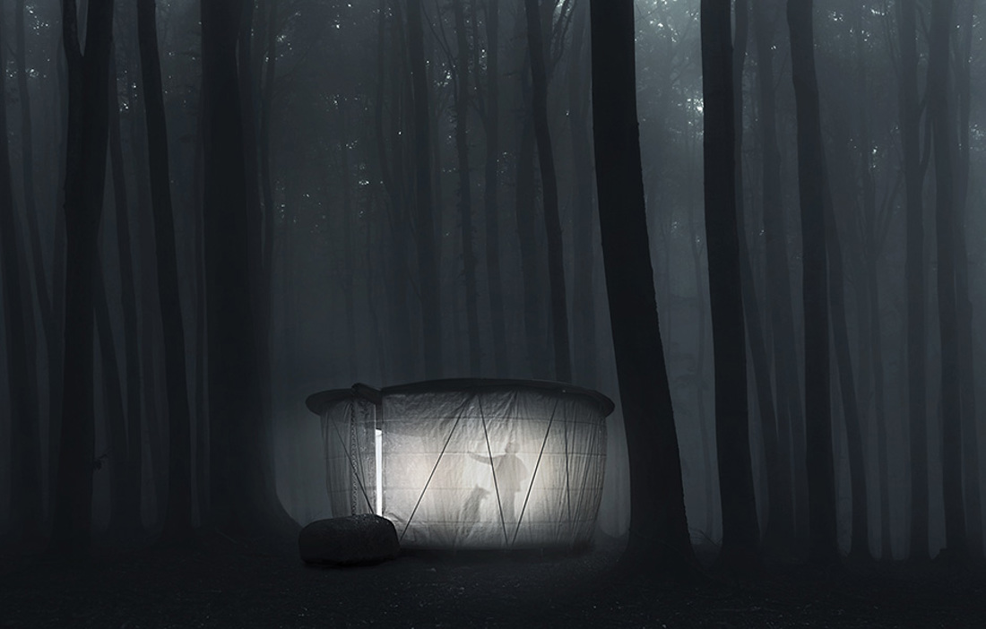 UPPIFRÅN SYNS ENDAST det lövformade blytaket på kojan, som smälter in väl i den omgivande parken, skogen eller trädgården. Så tänker sig arkitekterna Konrad Milton och Carl Jägnefält på byrån Jägnefält Milton den här diskret vackra kojan, som får byggas enligt attefallreglerna. Taket balanserar på en korspelare av trä. Både pelaren och parkettgolvet är tänkt att byggas av det träd som tagits ned för att göra plats för kojan. Det 1,2 ton tunga blytaket hindras från att tippa över genom ett jordankare av kätting som förankrats i en stenbumling intill. Från taket hänger ett draperi av polyurethanplast som besökarna kan dra för vid dåligt väder. Eftersom kojan är tänkt att byggas av nedbrytbara material kommer med tiden det enda spåret av byggnaden vara lövet av bly, en process som kan ta allt från 150 till 400 år, enligt Konrad Milton.