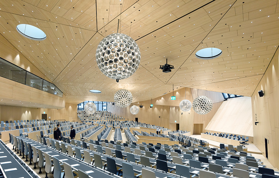 Fasaden har klÀtts med lÀrkspÄn, medan den invÀndiga beklÀdnaden bestÄr av akustiska paneler av vit gran, lÀrk och HPL-fanér. För att skapa en god akustik har arkitekterna samverkat med den vÀlrenommerade firman Mueller BBM. Rösterna i konferenscentret mÄste höras tydligt och klart utan ekoeffekter.