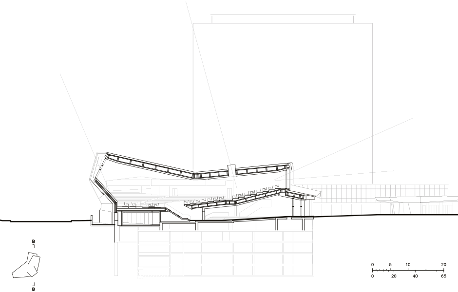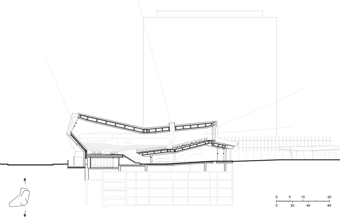 Byggnaden kurvar sig uppĂ„t pĂ„ ett sĂ€tt som aldrig skĂ„dats förut. Med en övervĂ€gande ogenomskinlig struktur ger den ett inĂ„tÂvĂ€nt, skulpturalt intryck, men Ă€r samtidigt ljus och inbjudande med de stora armar som strĂ€cker sig ut för att skapa öppningar mot omgivningen.