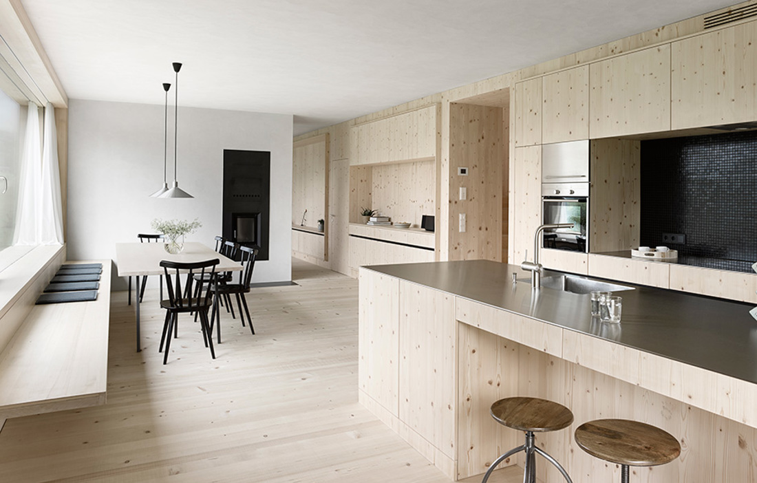 Den yttre fasaden består av grovt sågad vitgran. Granen dominerar även interiören, där alla golv och möbler är tillverkade i samma material. Det var ett självklart val för såväl arkitekten som för kunden. Vitgranen kommer från den närliggande skogen, som husägarna äger. Dessutom har de lokala hantverkarna lång erfarenhet av och stor kunskap om materialet.