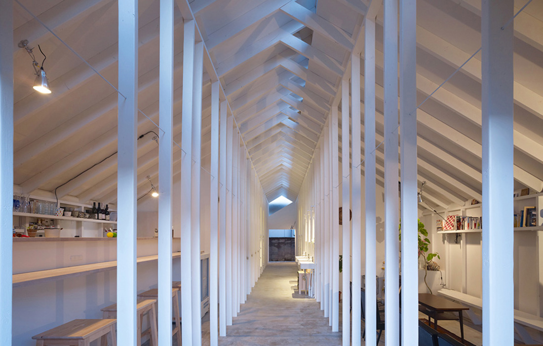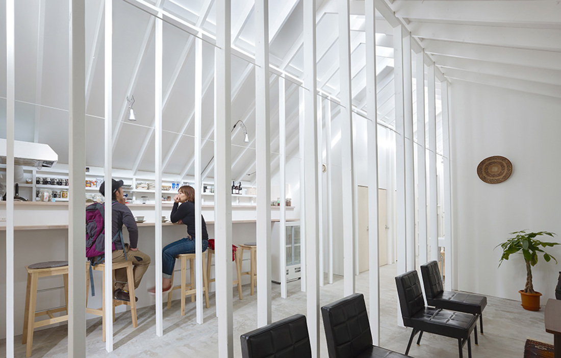 Gästhuset hyser också tre dubbelrum med inbyggda stegar till sovloften. Konstruktionen består av tunna träpelare och väggar med ljusinsläpp från taket, en hyllning till traditionell japansk arkitektur.