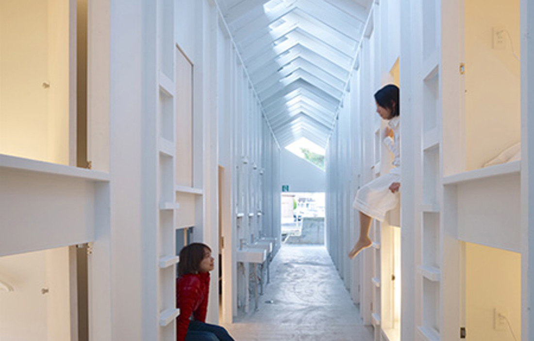 PÅ PLATSEN FÖR Unescos världsarv, det heliga japanska berget Koyasan, har arkitekterna Alphaville skapat ett gästhus för unga från hela världen. Byggnaden är en blandning av de berömda japanska kapselhotellen och en sovsal. Här finns en rymlig och ljus lounge för 20 personer samt åtta enkelrum där det enbart ryms en säng. Enkelrummens dörr öppnar upp mot en ljus hall och ger varje gäst möjlighet att själv välja när de vill umgås med andra boende.