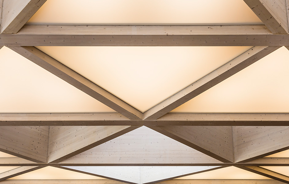 FASAD, TAK OCH STOMMENS limträbalkar är av gran. Fasaden är målad för att klara väder och vind, samt behandlad med ett brandskyddande medel. Invändigt är kyrkan utrustad med sprinklers för att ytterligare säkerställa brandsäkerheten. Ett vackert ekgolv ligger i kyrkan. Träslaget används även i de vertikala spaljéer som tillsammans med vitmålade gipsplattor utgör innerväggarna. De laminerade balkar som lämnats synliga i innertaket är en av de detaljer som kyrkans besökare lägger märke till allra först. Tillsammans skapar de ett triangelformat mönster som påminner om mönstret i en bikupa. Utformningen har konstruktionstekniska fördelar men även en estetisk och symbolisk funktion. Genom att lägga balkarna på det här sättet får man en styv konstruktion som klarar av att bära upp taket. Men lika viktig är mönstrets symbolik eftersom trekanten inom kristendomen representerar treenigheten. Det är dessutom en blinkning till hur insidan av valv i traditionella kyrkor brukar kunna se ut. Mönstret förstärks ytterligare genom de nio trekantiga fönstren som är placerade på taket.