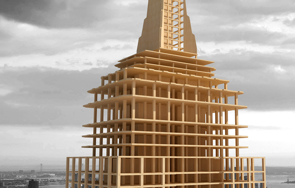 VÄRLDENS HÖGSTA TRÄD är ett exemplar av det amerikanska barrträdet sekvoja som når drygt 115 meter över marken. Det motsvarar cirka trettio våningar – eller en tredjedel av Empire State Building som under fyrtio år var världens högsta byggnad. Arkitekten Michael Green sticker ut hakan med ett förslag för hur det skulle vara tekniskt möjligt att bygga en träkopia av Empire State Building.