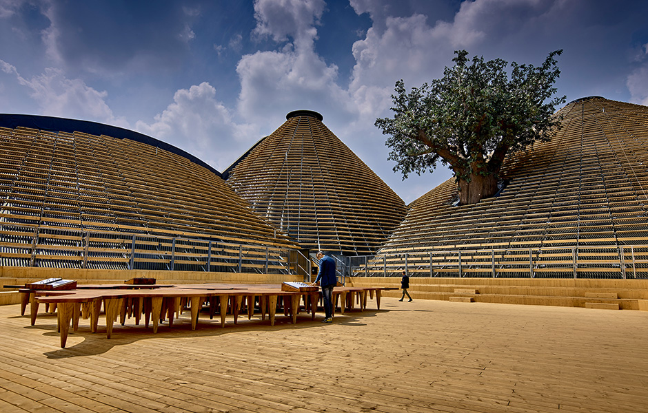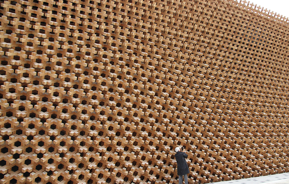 Det förvånar knappast att träbyggande präglar åtskilliga paviljonger, naturens byggmaterial går hand i hand med hållbarhetstänk och gastronomisk kultur. Kina har anlitat Tsinghuauniversitet, och före detta studenten Yichen Lu vid amerikanska Studio Link-Arc, för att modernisera traditionell kinesisk arkitektur med ett böljande lättviktstak i bambu. En molnlik konstruktion som visar hur stad och land kan leva i harmoni.