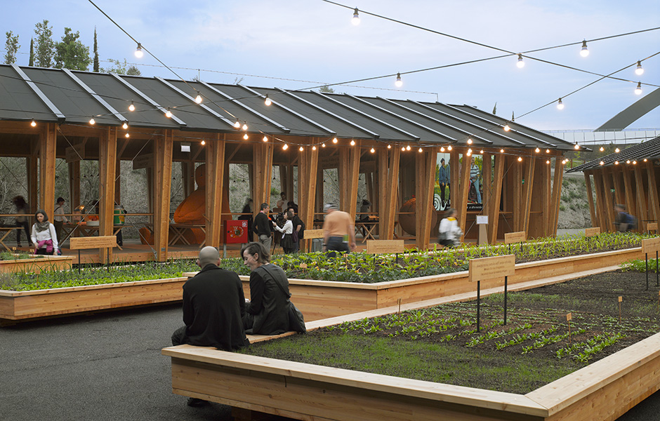 INTE DESTO MINDRE bjöd Slow Food in Herzog & de Meuron till att formge deras paviljong. Kunde man här återskapa andan man drömt om? Tre paviljonger byggda med kraftiga svagt lutande limträbalkar ger en spartan inramning för Slow Foods alla regionala matsensationer. Luftigt och enkelt som i Lombardiets gamla lador, som en matmarknad ute på landet. I paviljongen propagerar man för utrotningshotade maträtter och sinnlig njutning.