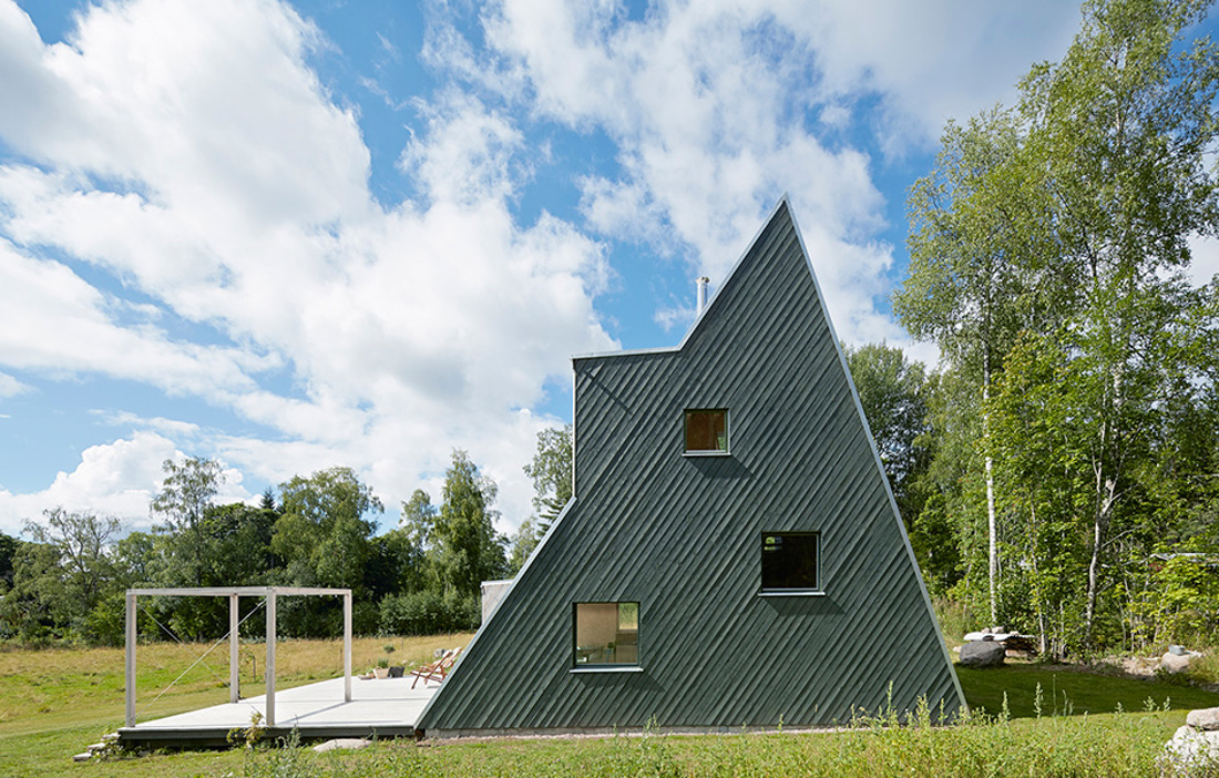 HUSET ÄR UTFÖRT i trä från in- till utsida. Stommen är utförd i kertobalkar som tillverkades på plats och sedan restes som ett stort A. Samtliga lager i tak och väggar är träprodukter, förutom tätskikt. Huset är klätt invändigt med plywood av ask från Egmonts nedlagda pusselfabrik, kortsidans fönster och samtliga dörrar är fynd från Blocket. När alla fönster är öppna ser man att fönstren är hängda åt olika håll, något som bidrar till husets uppfinningsrika känsla och den "vuxenkoja" Leo beskrivit den som. Utvändigt är huset klätt i gotländsk kärnfura behandlad med en miljövänlig kiselbaserad olja. Vägen fram till träbeklädnaden var dock inte spikrak och öppnade Leos ögon för vad trä är, kan vara – och hur en stor del av träindustrin förhåller sig till det.