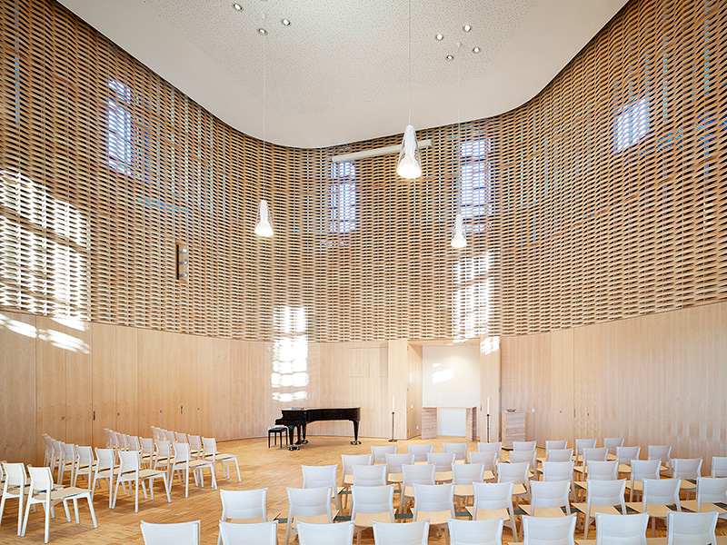 Arkitekterna Björn Edström och Christer Malmström hämtade inspiration till detta universal-ritual-centrum från bland annat Skogskyrkogården i södra Stockholm. Byggnaden får sin prägel av den asymmetriska, tornliknande huskroppen med rundade hörn. Här inne finns själva kapellet.