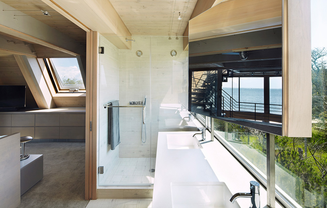 Utsikten är numera milsvid över vattnet från de tre våningarna. Trämaterialen är exponerade så väl exteriört som interiört och hela huset är rustat med energivänliga metoder och tekniker. Originaltrappan i plåt, som tronade likt en elefant mitt i huset, ersattes av en dito med trä som dominerade material. Trappan placerades längs hemmets väggar, sammanlänkade med loftgångar tvärs över våningsplanen.