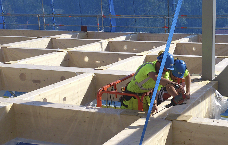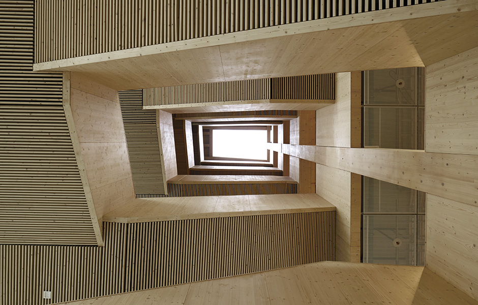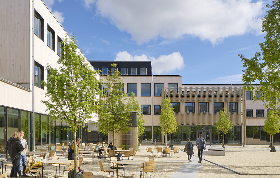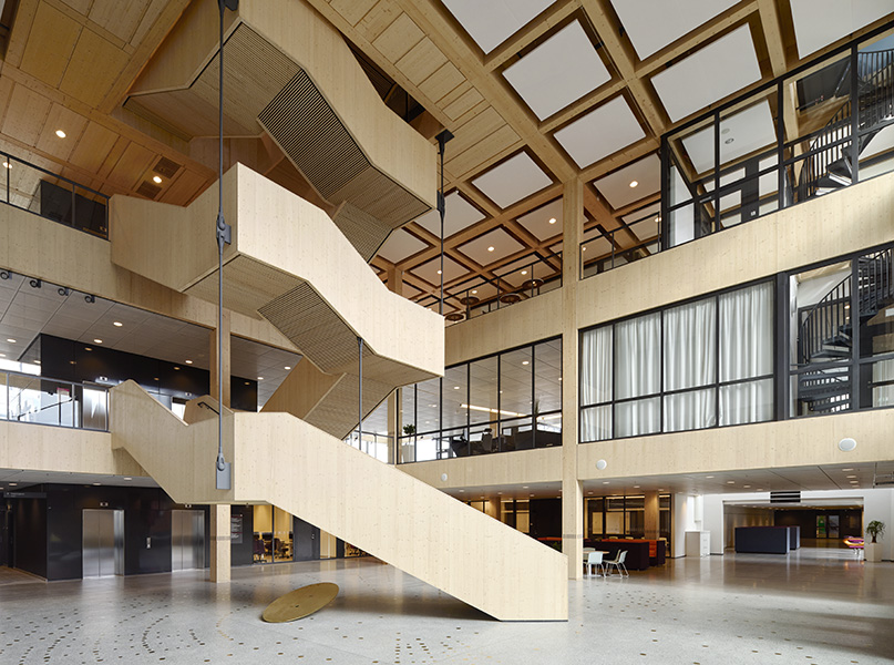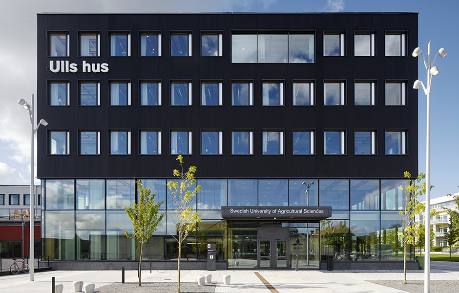 På Ulls hus – Sveriges lantbruksuniversitets, slU:s, nya huvudbyggnad – smyger studenter upp och ner i den mäktiga trätrappan. Andra står med en kopp kaffe eller diskuterar på trappans små avsatser som är placerade mellan de sex våningsplanen. Det vackert obehandlade räcket känns varmt mot handen och doftar gott av gran. Trappan dominerar interiören i entrébyggnaden, den så kallade Kuben, och fångar direkt uppmärksamheten hos den som stiger in. Men det är inte bara trappan som är av trä – materialet syns i fasad, väggar och inte minst i den exponerade trästommen.