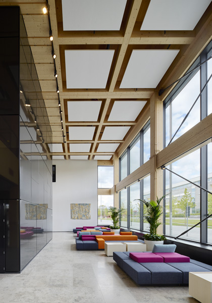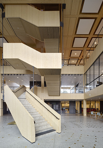 KUBEN ÄR UPPBYGGD kring en limträpelarstomme, och när man kliver in i huvudentrén möts man av ett 1 000 kvadratmeter stort tak med synliga limträbalkar och bjälklag av KL-trä. Mellan dessa har frihängande absorbenter placerats för att hantera akustiken. För att taket ska kunna upplevas i sin helhet och för att understryka att entréhallen är ett enda rum, är alla mellanväggar glasade.