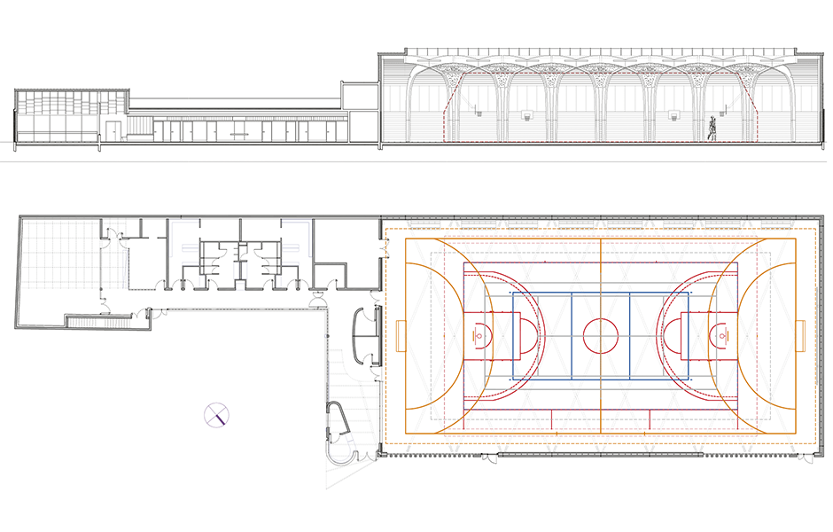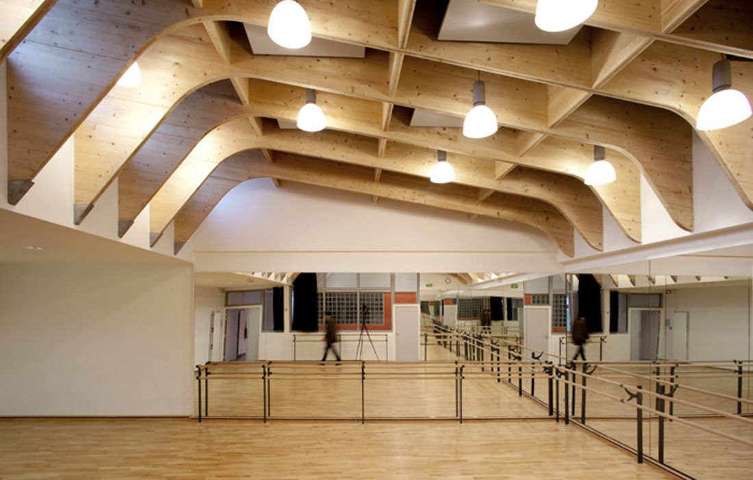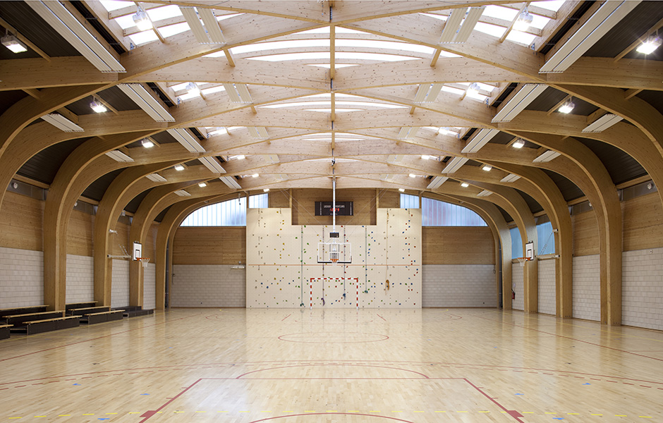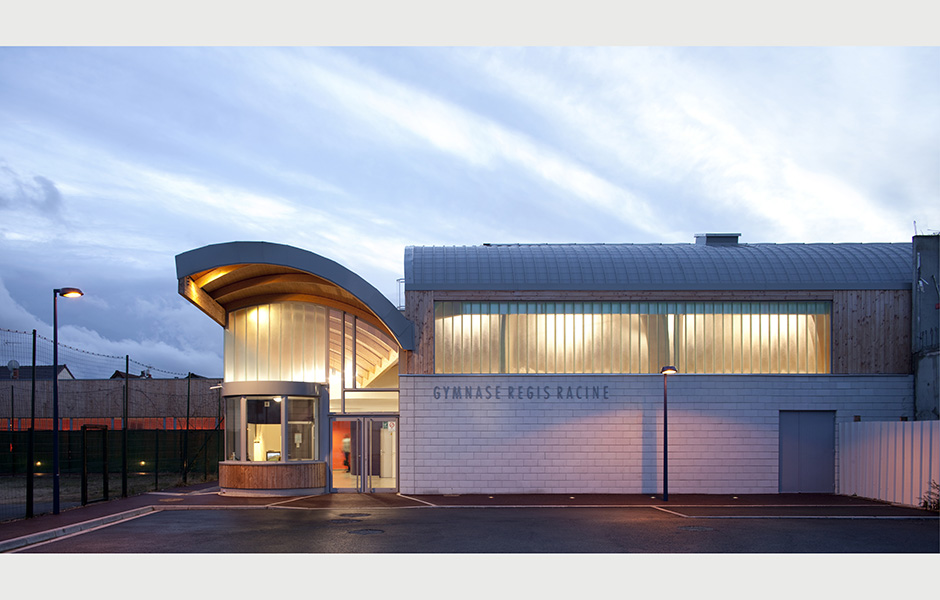 I DAG ANVÄNDS Régis Racine framförallt av lokala skolor och idrottsföreningar. Själva sporthallen är optimerad för regionala basketturneringar, men byggnaden rymmer också en hall för baletträning. De massiva valven och takhöjden på sju meter gör det svårt att inte tänka på en gotisk katedral – om än med valv av limträbalkar i stället för sandsten. Att valet föll på trä hade flera orsaker, berättar Alexandre Dreyssé. För det första det stora takspannet: med en yta av 44 gånger 22 meter blev limträbalkar helt enkelt det mest rimliga alternativet. Att bygga med prefabricerade trämoduler innebar dessutom en mindre belastning på grannskapet i det tätt befolkade området. Och när beställaren, kommunen, ville se en byggnad av ett tåligt naturmaterial var saken klar. Också vad gäller byggnadens utseende var det platsens egen karaktär som visade vägen för arkitekterna – inte minst det faktum att fasaden är nästan helt omgiven av andra byggnader.
