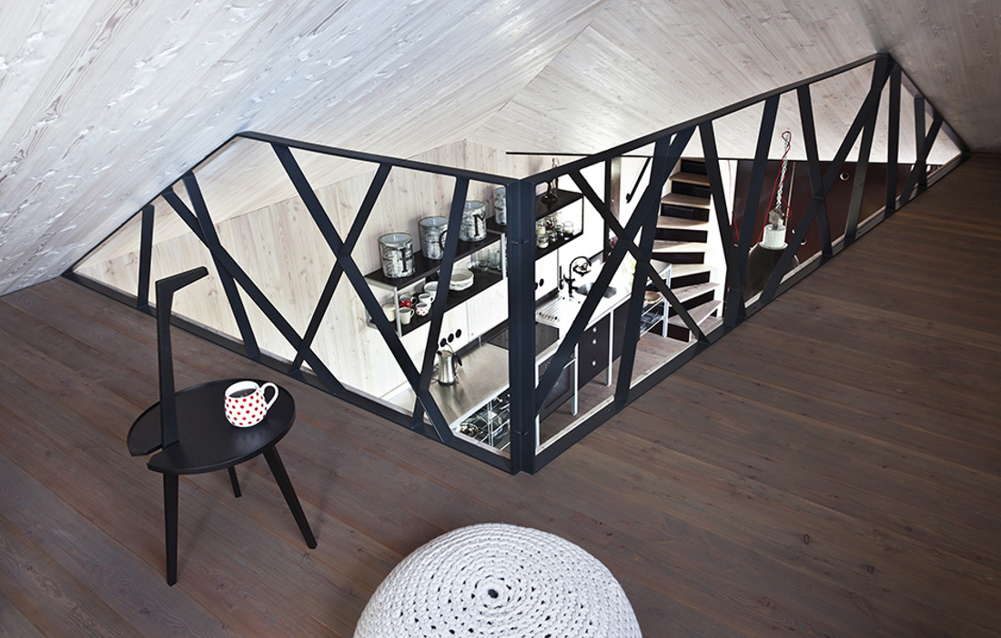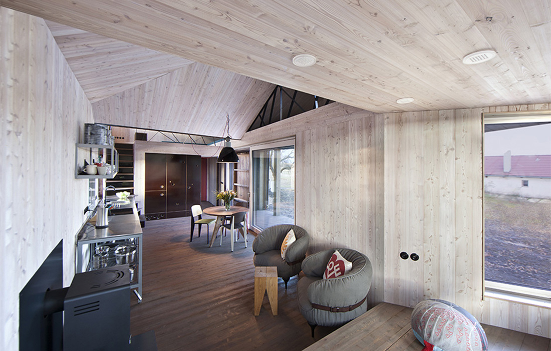 Arkitekterna löste det genom en huskropp präglad av vinklar i skuggan av lövverket. Den bärande stommen är konstruerad av KVH (fingerskarvat konstruktionsvirke) medan fasaden, taket och innerpanelerna alla är utförda i lärk. Fasaden är sedan bränd och betsad. De stora glasytorna gör det möjligt att dra nytta av solens strålning vintertid, medan de stora skjutluckorna – också de av lärkträ – skapar skugga när sommarsolen blir för stark.