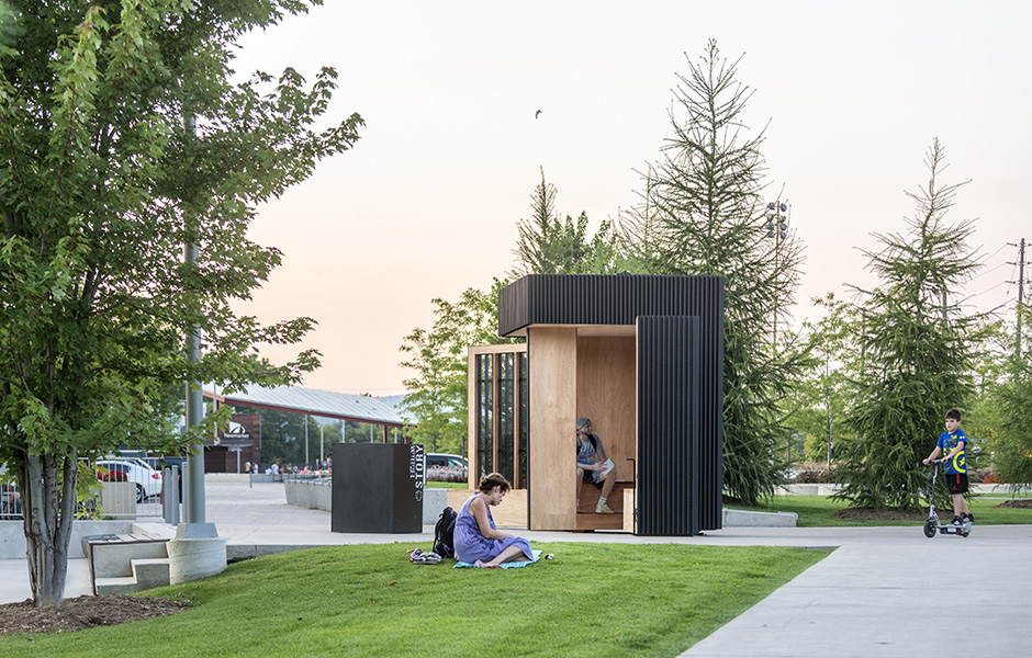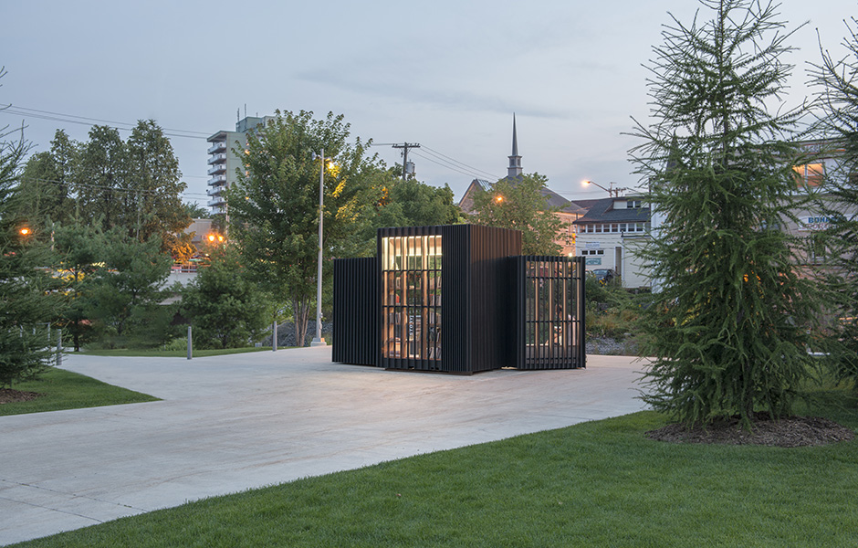 BIBLIOTEKEN BLIR MINDRE och mindre när engagerade medborgare världen över samlar ihop litteratur och ställer till allmänhetens förfogande i gamla telefonkiosker och hemsnickrade lådor. »The story pod« ritades av arkitektbyrån Atelier Kastelic Buffey för en nyanlagd park i Toronto. Volontärer stod för själva bygget, under ledning av arkitekterna. Byggmaterialet donerades av ett finansbolag. För att hålla nere kostnaderna är det lilla biblioteket byggt av standardvirke från brädgården, medan interiören är klädd i enkel plywood med yta av svarvad cedarfaner. Bokhyllorna är byggda av massiv jättetuja (western red cedar).