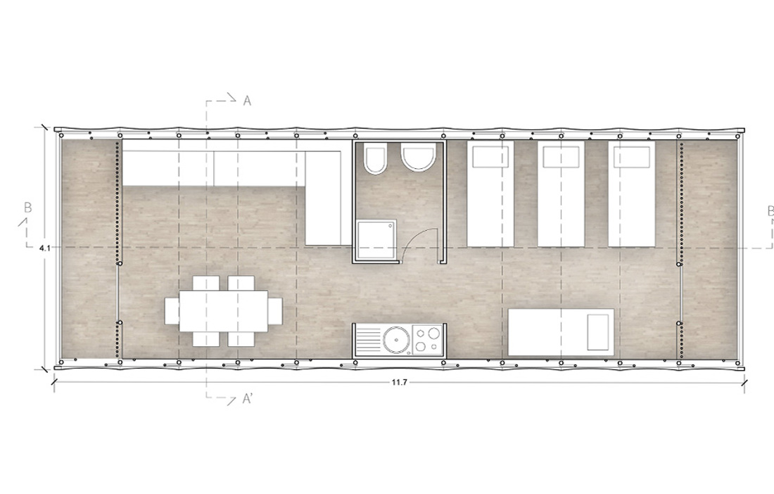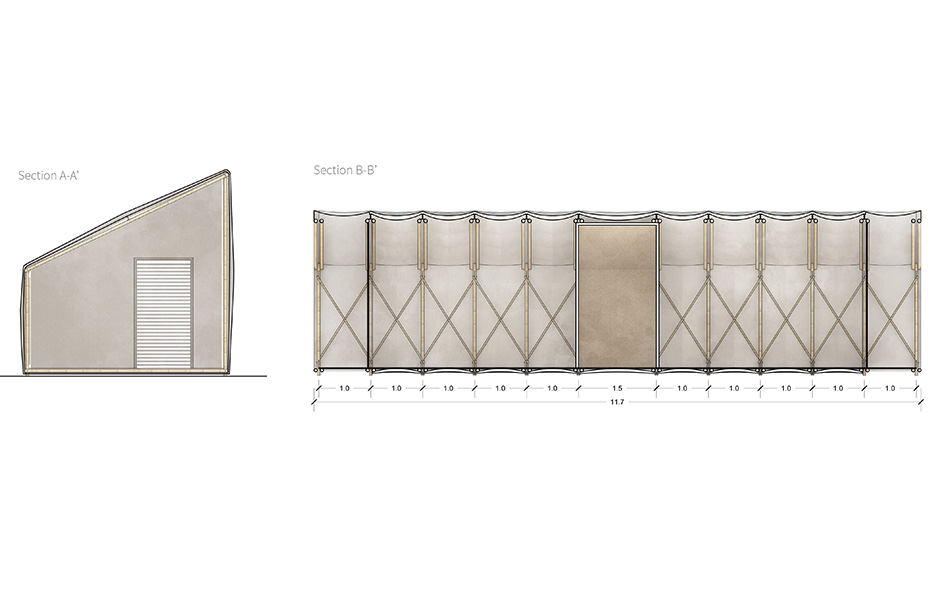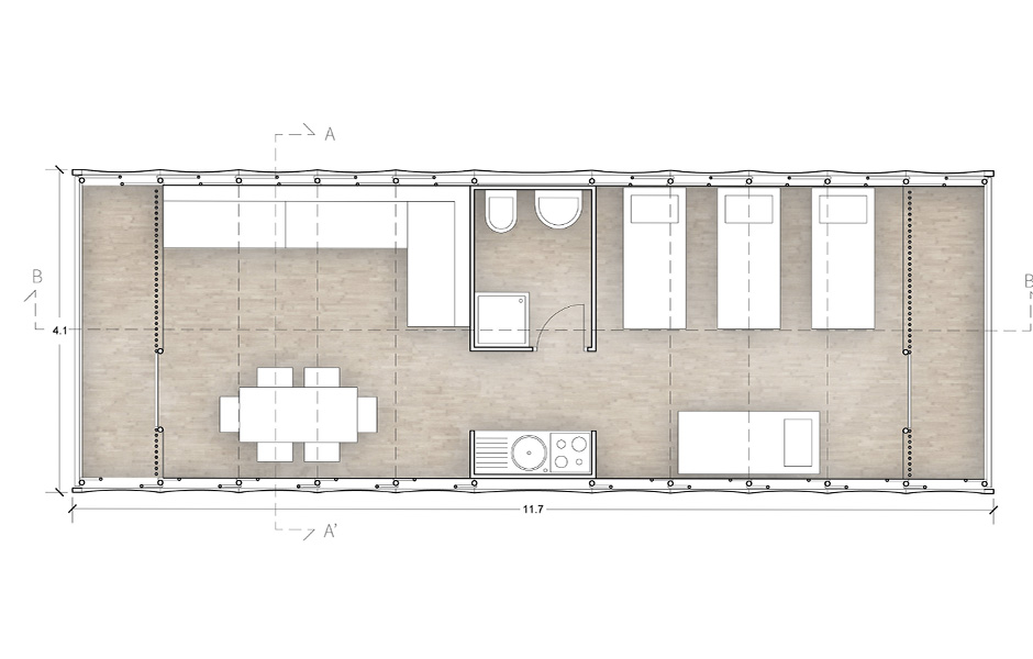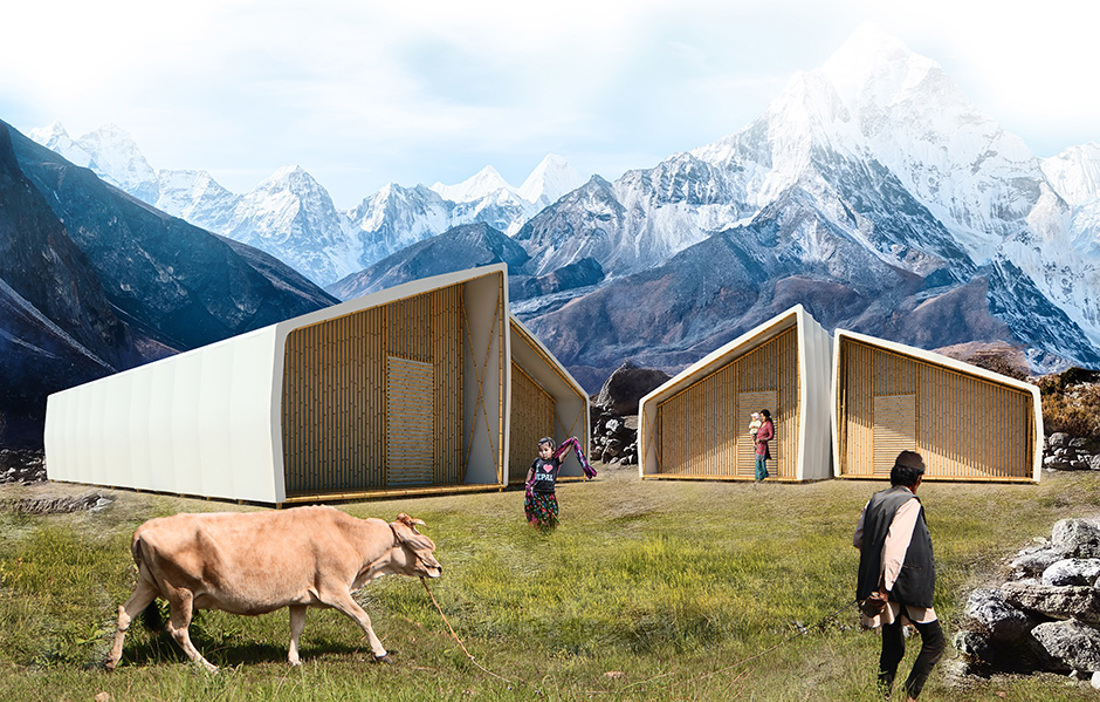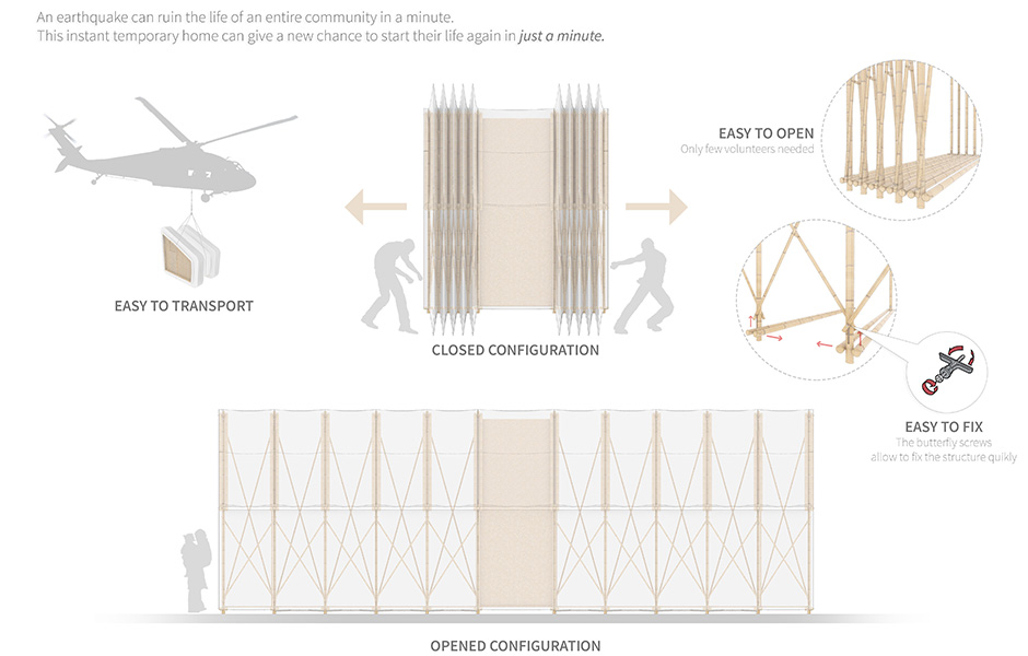 Bambun i den bärande stommen kan skördas lokalt. I gavlarna sitter transparent polykarbonatplast på bambureglar, medan andra änden monteras ihop med husets mittdel av OSB-skivor. En bambustomme får plats på var sida om kärnan, som hyser nödvändiga funktioner som kök och toalett. Det hela täcks med regntät plast innan konstruktionen trycks ihop som ett dragspel. Därefter transporteras den med helikopter eller lastbil till den plats där huset behövs. Sidorna av bambu dras ut igen och voilà: en tvårummare med kök! Mellanrummen mellan bambun och den regntäta plasten isoleras med ull, gamla kläder eller vad som finns till hands.«