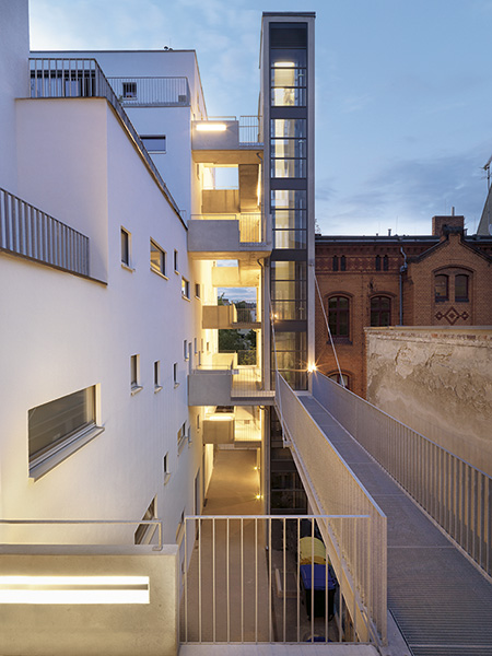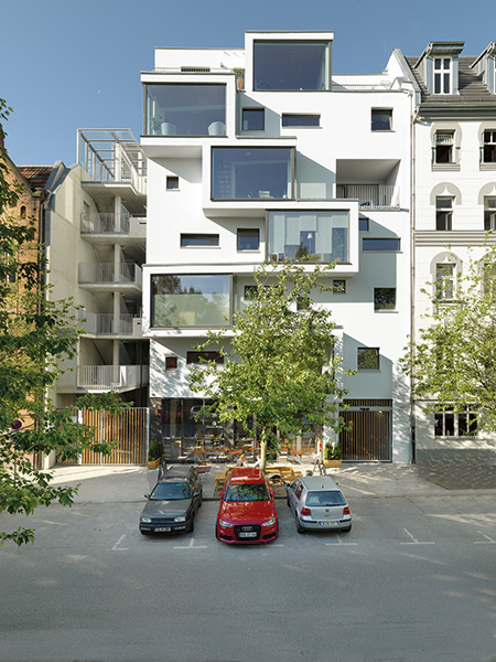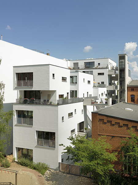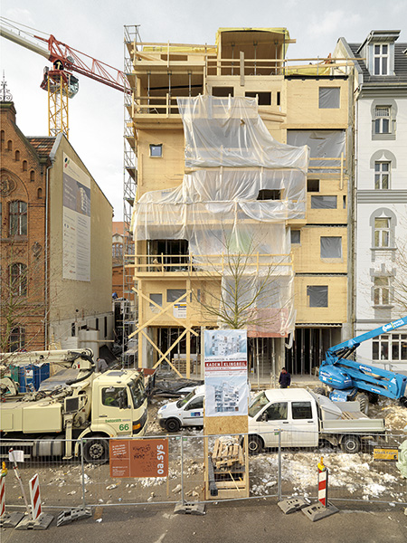 I Prenzlauer Berg, en stadsdel i Berlin, byggdes 2012–13 ett hus som innehåller bostäder, kontor, dagis, restauranger med mera. Det består av två huskroppar, ett främre hus med sju våningar och ett bakre med fem. De är byggda i trä på en undervåning av betong som bland annat innehåller ett parkeringsgarage. Huset är inramat av äldre hus. Ingångar och hiss är, av brandskyddsskäl, förlagda till utanpåliggande betongtrappor och ramper och anslutna till ett närliggande äldre hus. Det här är ett exempel på hur nya trähus i tät gammal stadsmiljö kan byggas.