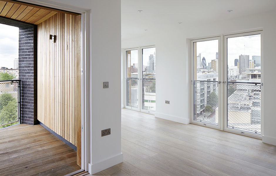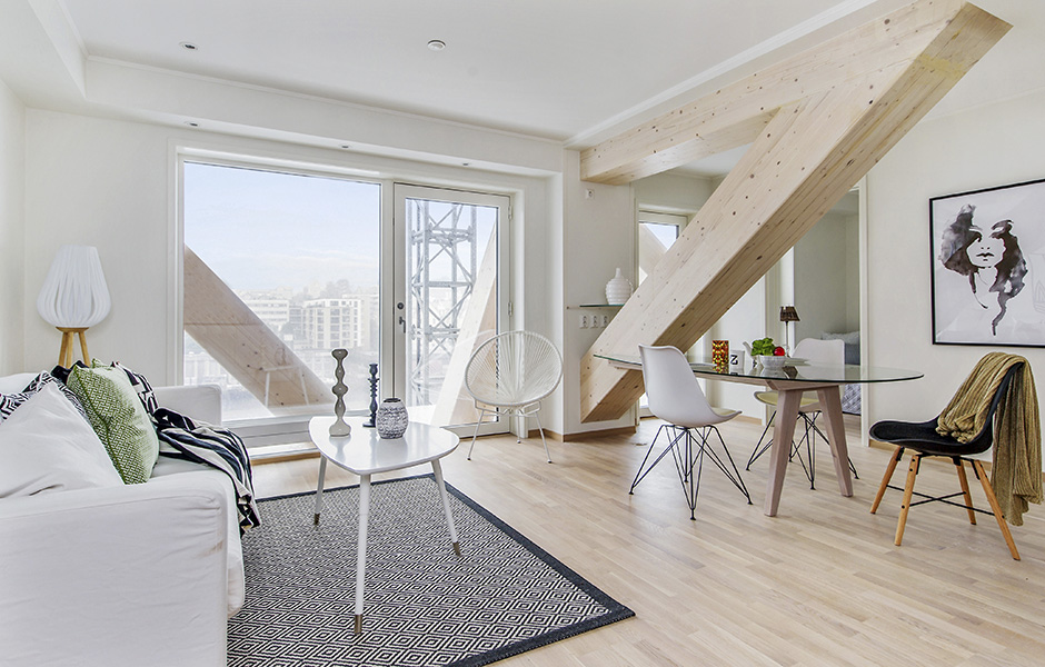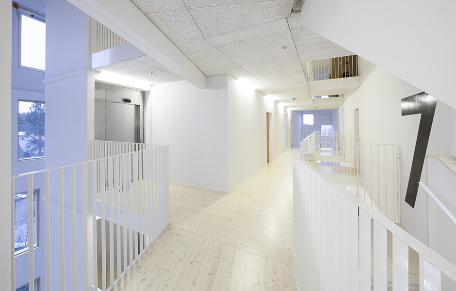 I lägenheterna har träytan lämnats synlig i tak, och golven har försetts med parkett. Väggarna har beklätts med gipsskivor, dels för att kunna färgsätta dem och dels för att uppfylla brandkrav. KL-trä fungerar som bärande och stabiliserande konstruktion, som ångspärr och som del av värmeisoleringen. Ett skikt av betong, med inlagda värmerör, göts ovanpå det bärande golvet för att förstärka stegljudsisoleringen.
