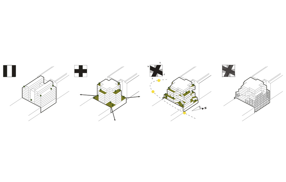 Arkitekturen är iögonfallande. Våningsplanen är korsformade med något förskjutna armar. Genom att vrida dem parvis hindras insyn från grannarna samtidigt som det skapas terrasser med olika orientering. Lägenheterna får genom sina stora fönster ett stort och naturligt ljusinsläpp.