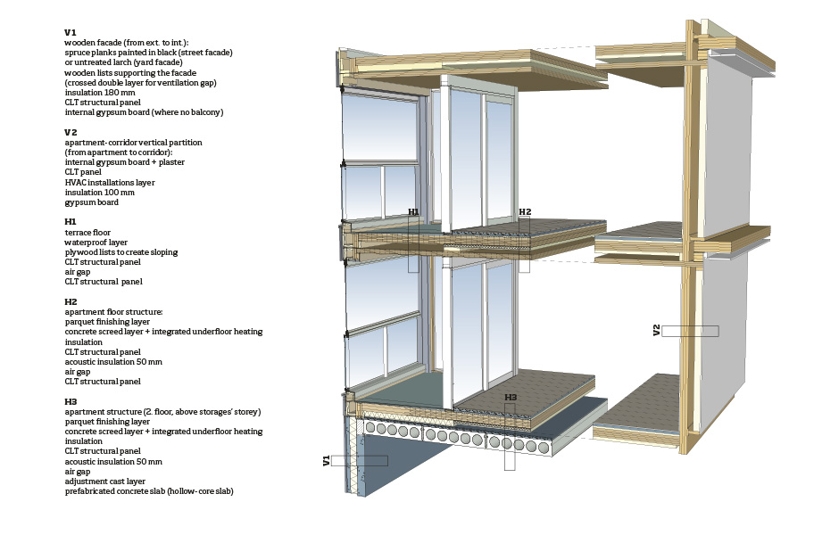 Ett uttalat mål med projektet är att pröva en ny byggprocess för billiga och ekologiska bostäder. Förtillverkade moduler tillverkade inomhus och fullständigt förberedda för inkoppling på byggplatsen ska garantera hög kvalitet, väderoberoende och minimerad tidsåtgång på byggplatsen. Varje lägenhet består av två moduler. I en finns vardags- och sovrum samt balkong. I den andra finns badrum, kök och hall. Installationer är åtkomliga från korridoren som, liksom trapphus och hisschakt, är byggda med KL-trä.
