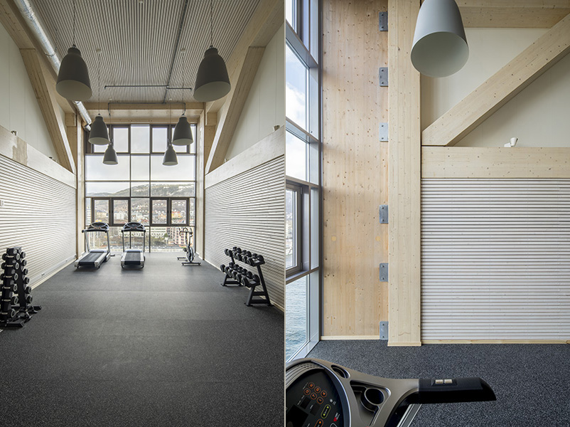 Fackverket med sina inslitsade knutplåtar av stål måste vid brand bibehålla sin bärförmåga i 90 minuter. För att beräkna effektiva dimensioner förutsätts att limträ kolar cirka 0,7 millimeter per minut. Sekundärt bärande konstruktioner, såsom korridorer och balkonger, ska ha tillräcklig bärförmåga kvar efter 60 minuter. Trappor och hisschakt är byggda av kl-trä behandlat med brandhämmande lack, och huset är försett med sprinkleranläggningar. Utanför fackverket har glas monterats på två fasader och på gavlarna rosttröga stålplåtar.