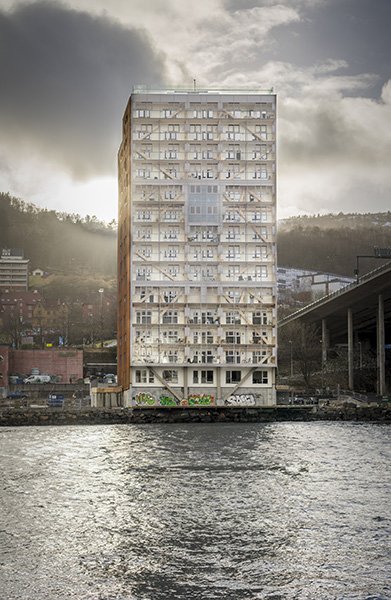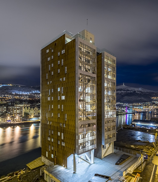 Världens högsta trähus ligger i Bergen och är cirka 45 meter högt. Det har 14 våningar med 62 lägenheter. Det är uppdelat på höjden i tre likformiga delar. Ett utanpåliggande limträfackverk och två stabiliserande våningsplan av betong tar hand om vertikala och horisontella laster.