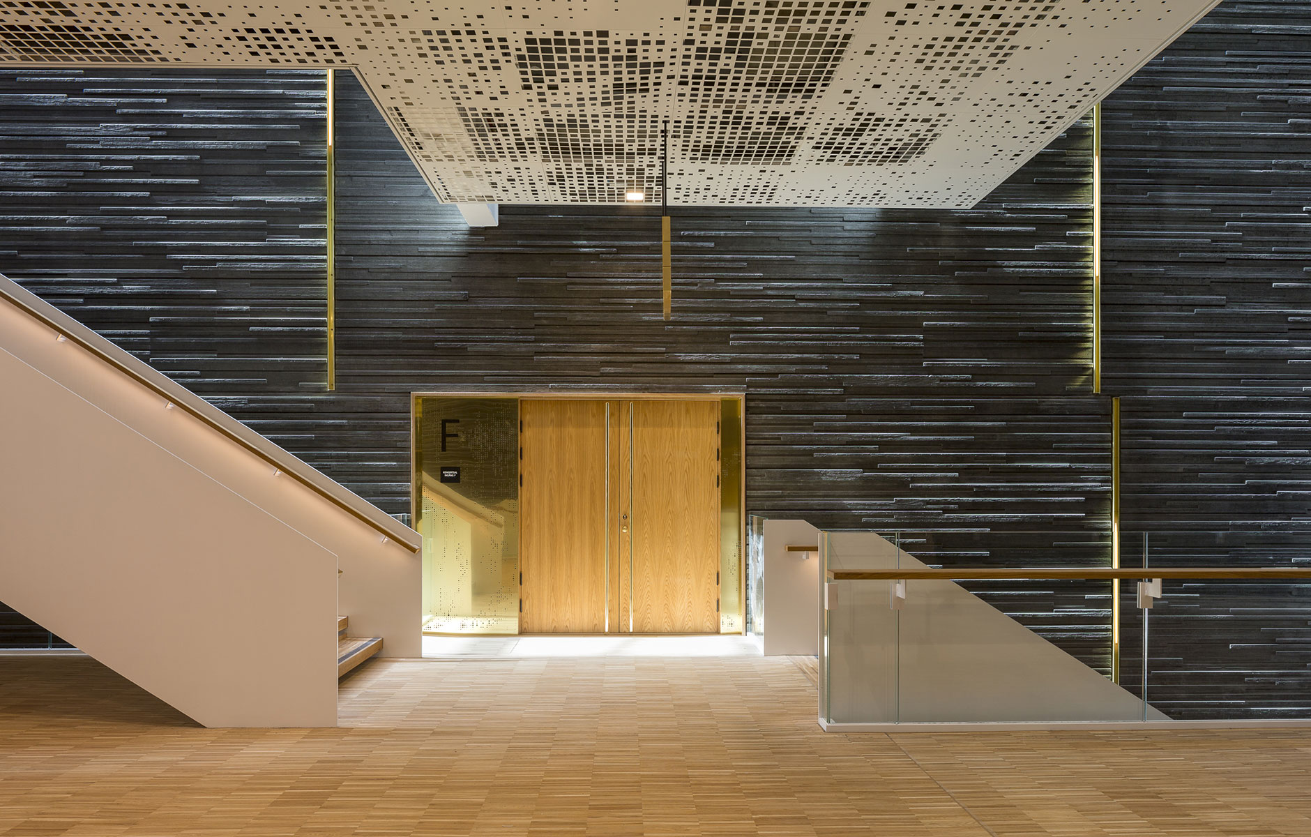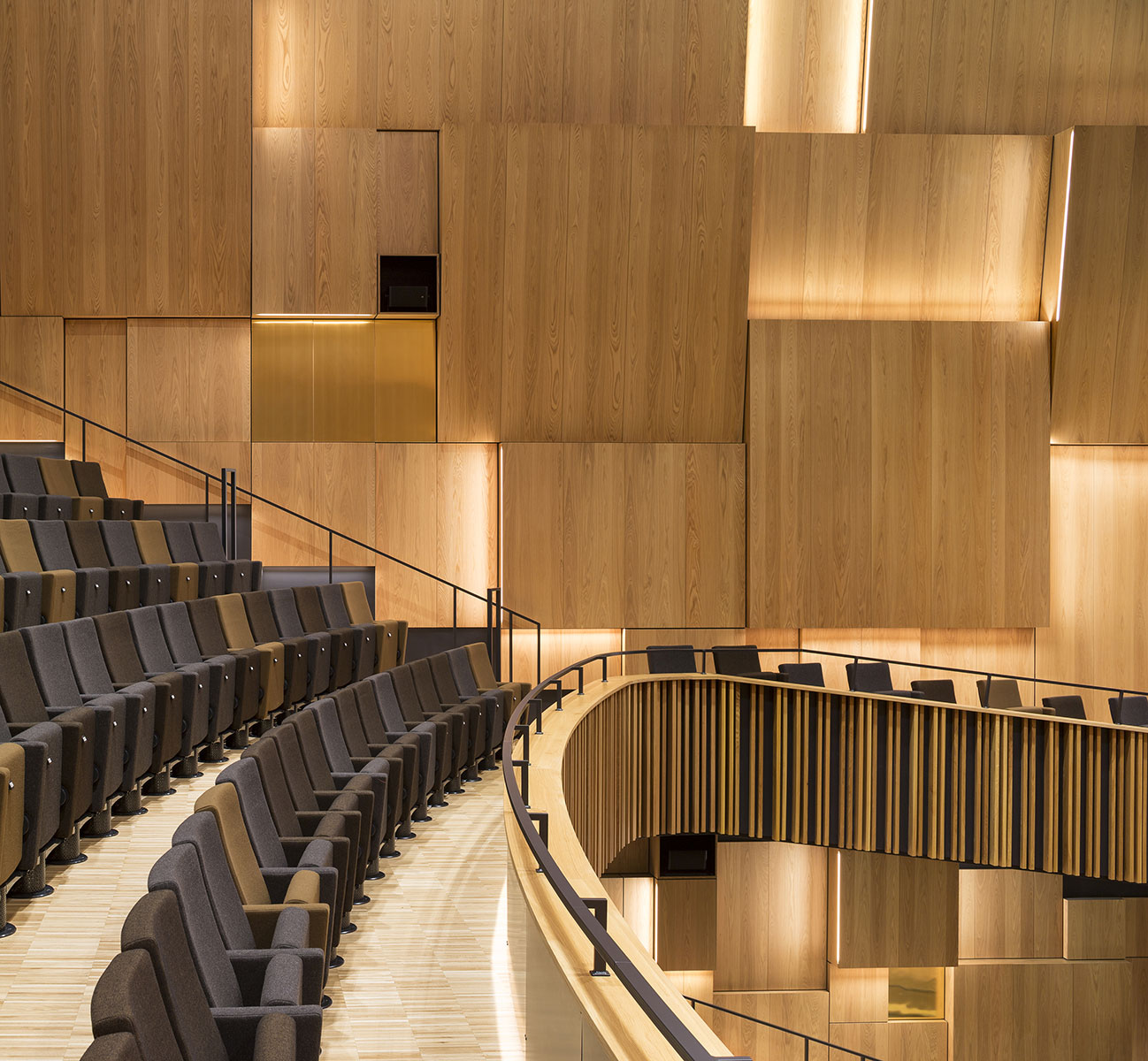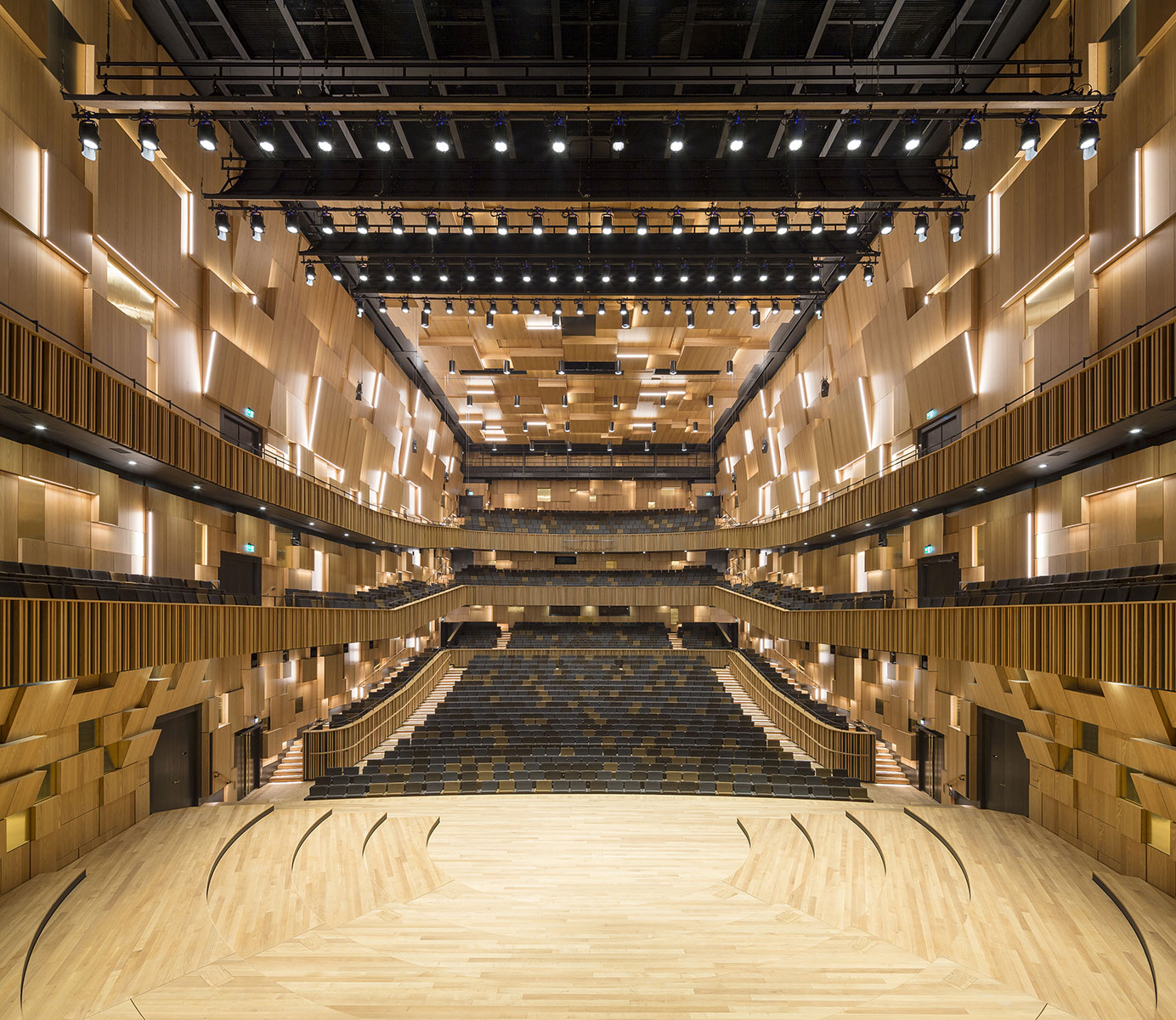 Husets stora konsertsal rymmer 1 600 personer, och dess akustik är beräknad med hjälp av avancerade lasermätningar och 3d-modellering – förutom papperspåsarna, alltså. En grundprincip för bra akustik är att ta bort alla parallella ytor som skapar störande ekon och resonans. Väggarnas ojämna ytor sitter alltså inte där bara för att vara vackra – i dem sitter nyckeln till salens perfekt avvägda klang. De ekfanerade, olikformade lådorna kallas mondrianska element efter den holländska konstnären. Förutom att förhindra oväntade ekon sprider de ut ljudet i lokalen så att det låter likadant överallt. Panelerna kommer från den svenska tillverkaren Gustafs som specialiserat sig på akustikelement.«