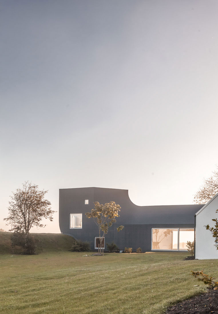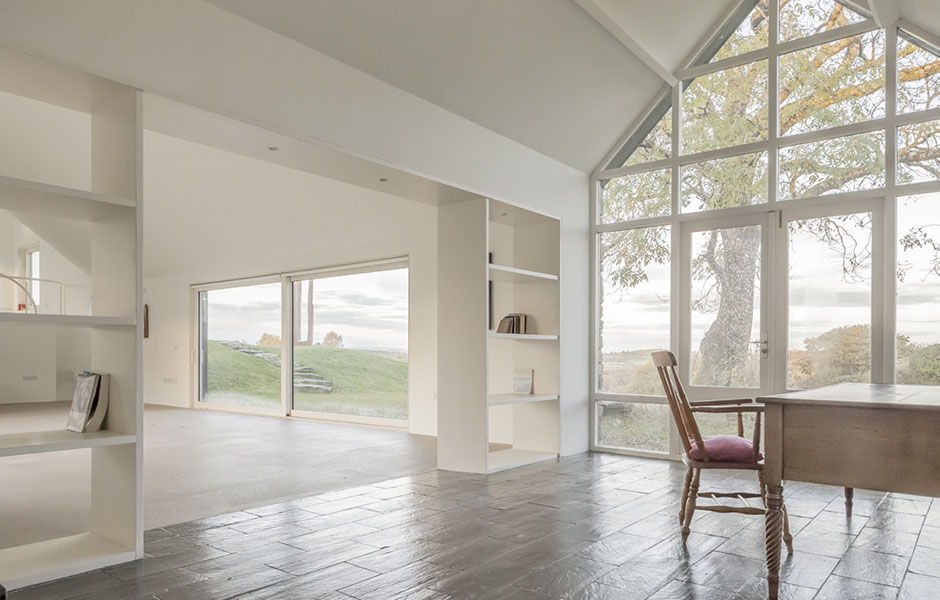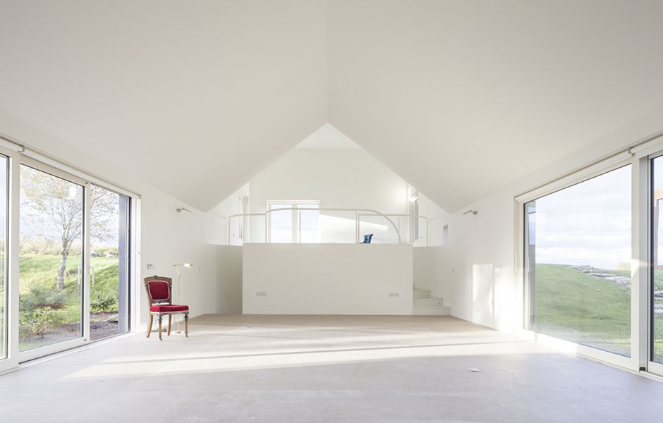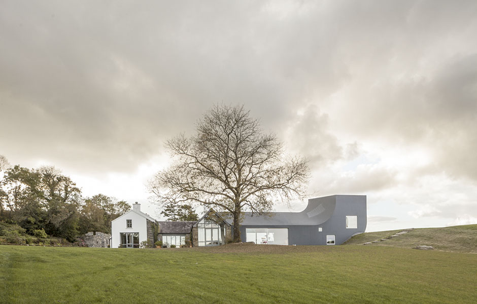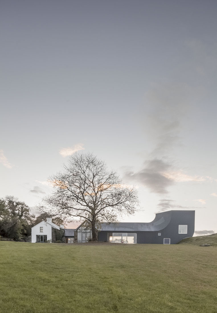 »En uttrycksfull skulptur.« Så beskriver den Zürichbaserade arkitekten Markus Schietsch sin utbyggnad av en privatvilla i Inchigeelagh nära staden Cork, Irland. Det mest skulpturala tillägget i den nya flygeln torde vara en vinkelrät sväng mot himlen där byggnaden möter en naturlig förhöjning i marken på östsidan. Resultatet blir ett tak i form av en närmast arketypisk husgavel med sadeltak. I svängen mot himlen placerade arkitekten den nya entrén.