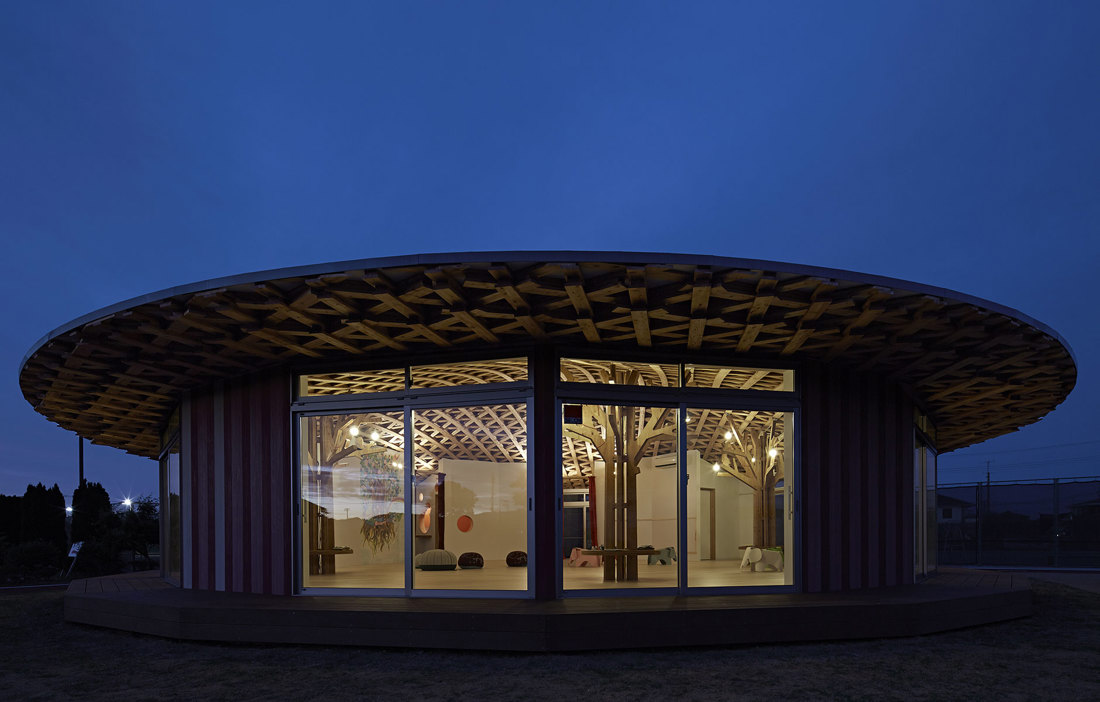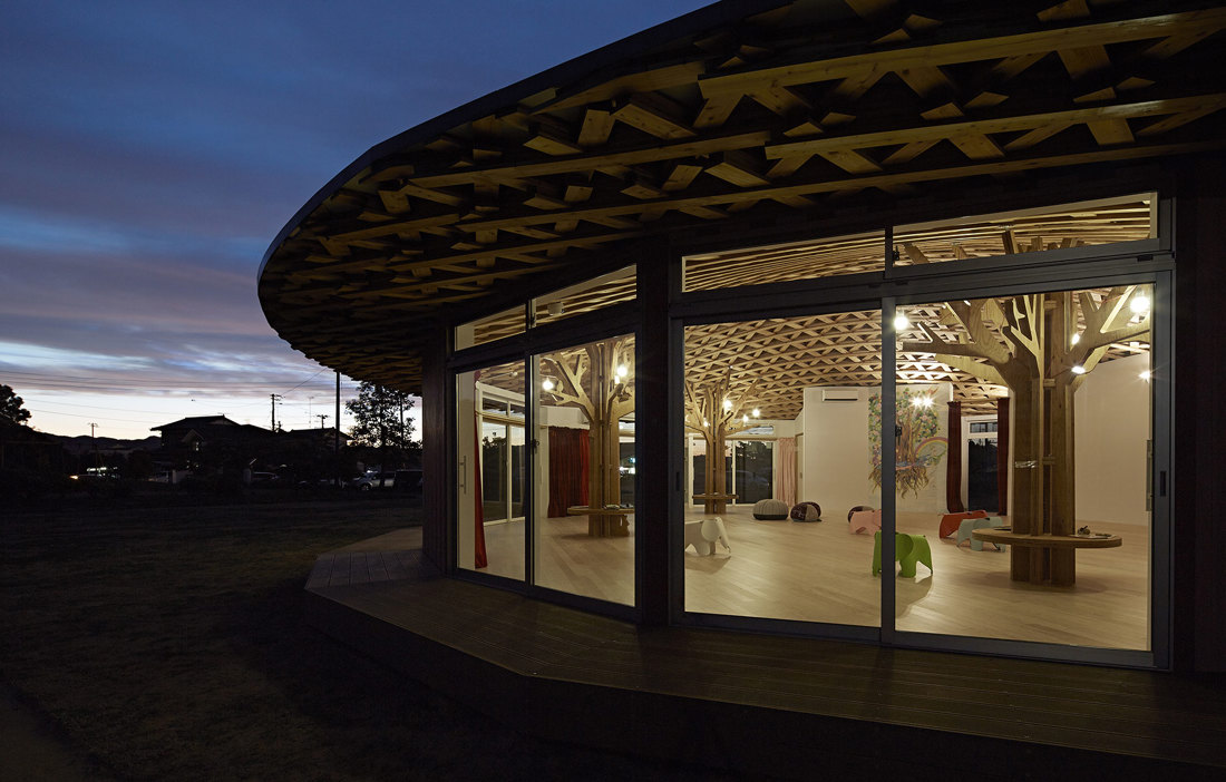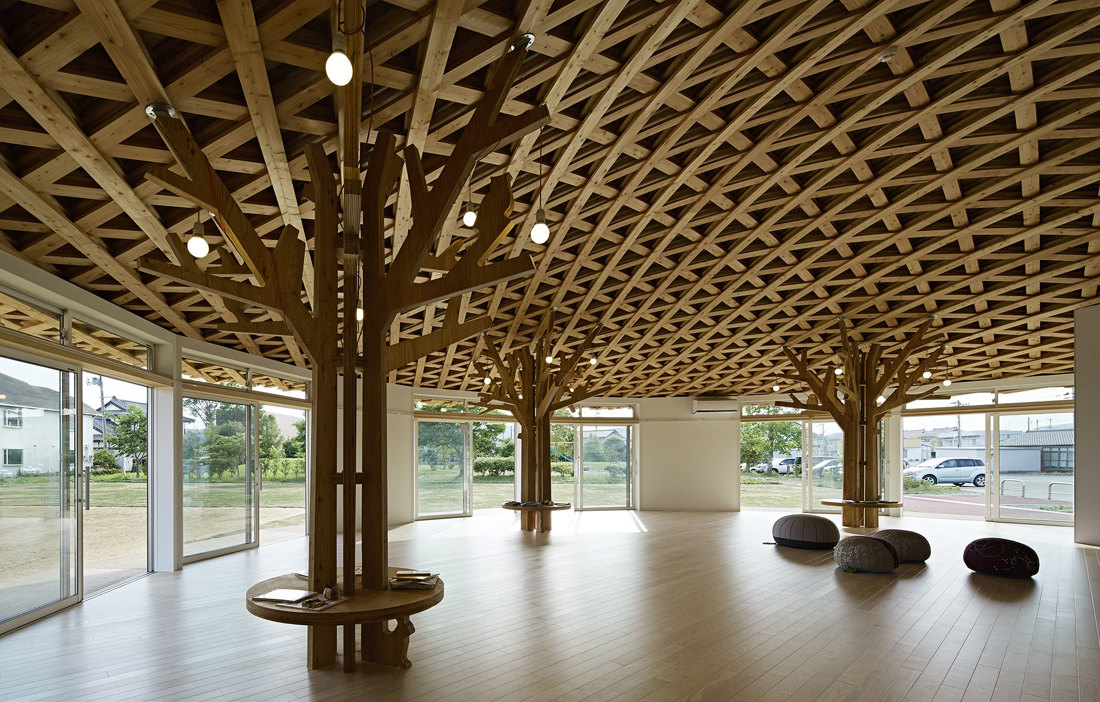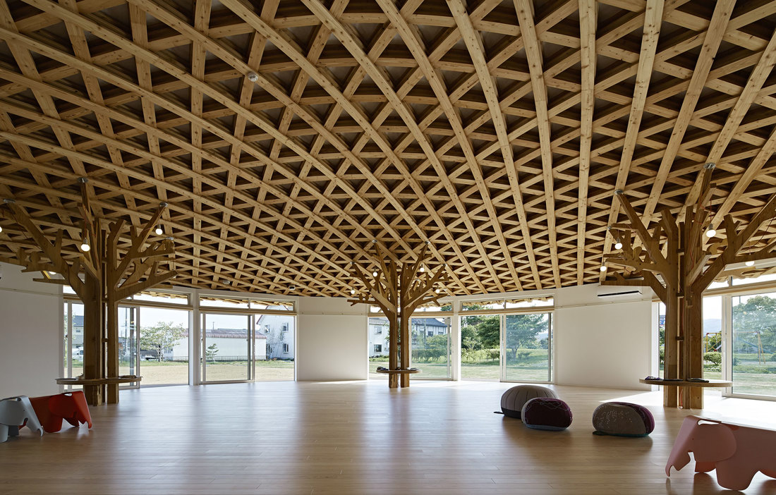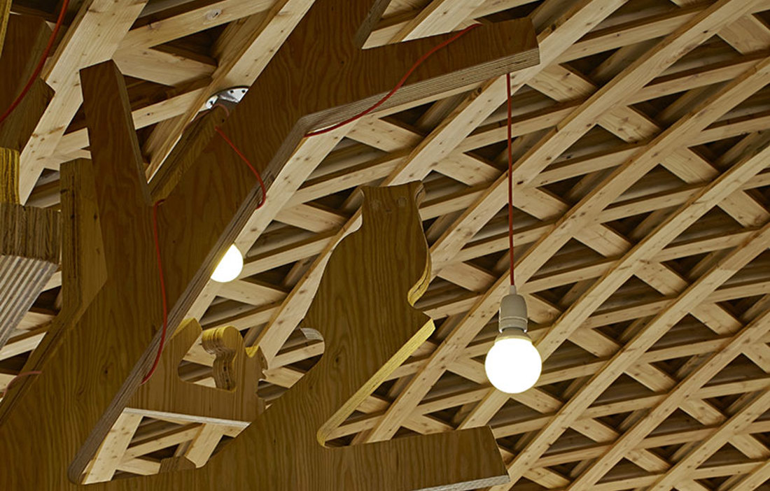 Innertaket av plankor – uppburet av tre trädformade pelare kompletta med ugglor, ekorrar och andra djur i grenverket – ska ge barnen en känsla av att leka i en skogsglänta. Taket är uppbyggt av nio lager plankor av furu, lagda korsvis över en kupolformad mall. Plankorna går över hela takets radie – de längsta är 20 meter långa. Det ger en stark och lätt takkupol som dessutom påminner om en traditionell japansk stråhatt. Trädpelarna är tillverkade av kl-trä. Även väggarna är byggda i trä, om än med mer konventionell regelteknik.«