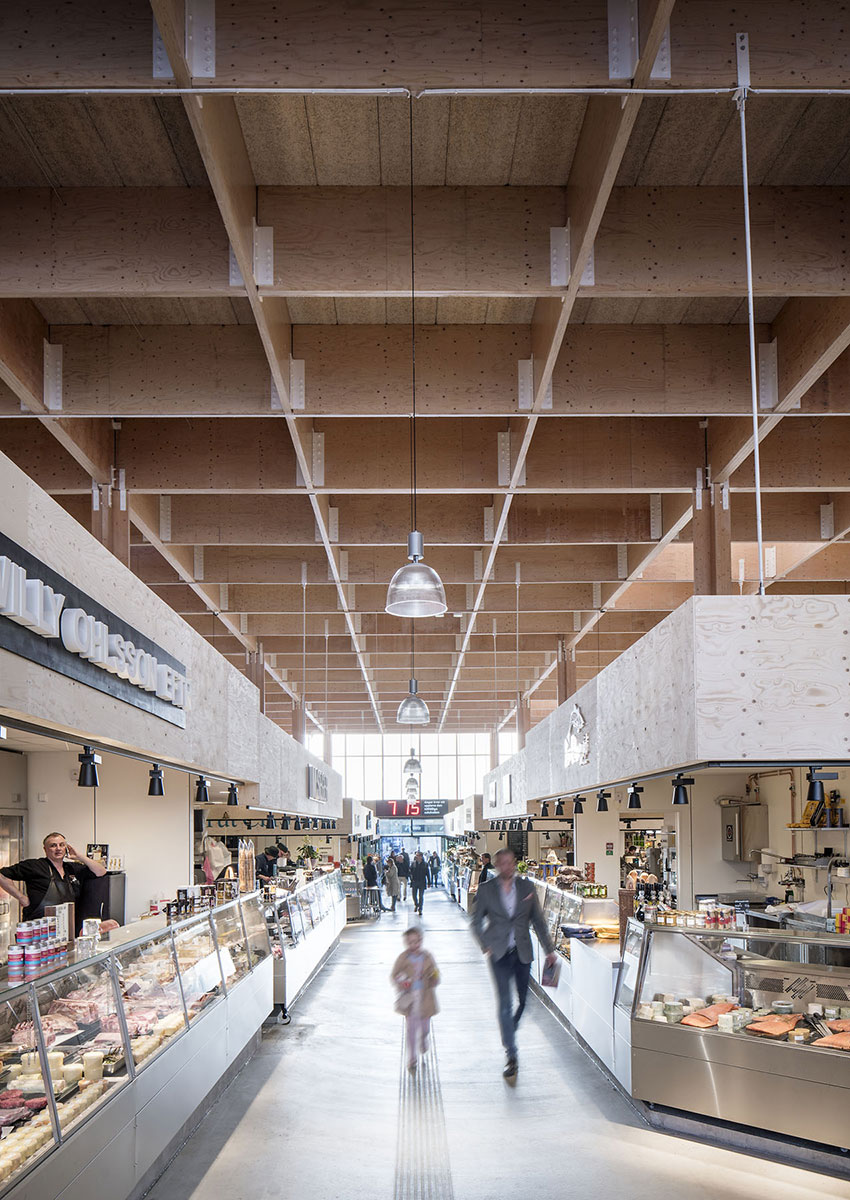 De svåra markförhållandena på torget gjorde att trä med sin lätta vikt var ett självklart val. Dessutom är det förnybart och ekologiskt, miljövänligt och klimat-smart. Saluhallen är uppförd med en synlig stomme av fanerträbalkar som vilar på kryssformade pelare av limträ. Nedre delen är klädd med obehandlad träläkt av varierande tjocklek. Övre delen är klädd med kanalplast som släpper in ljus och på kvällen lyser upp omgivningen som en stor trälykta.