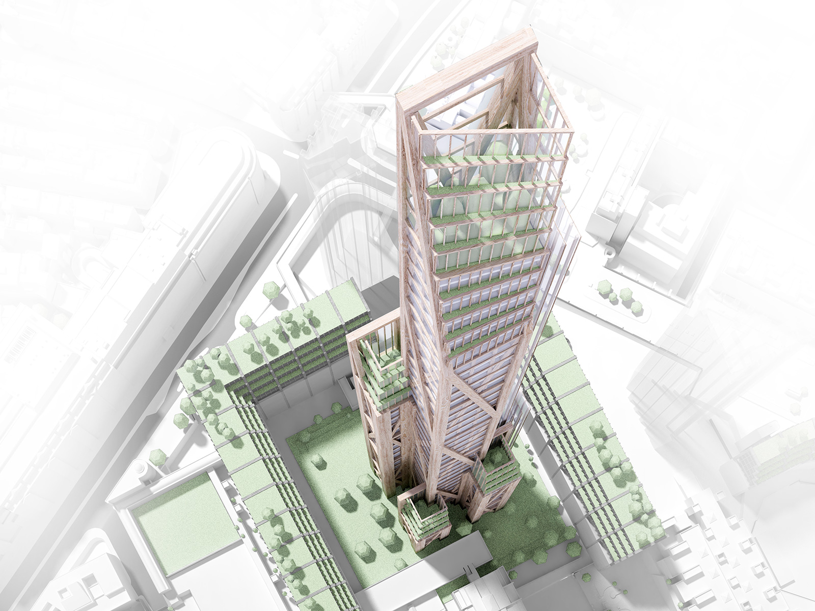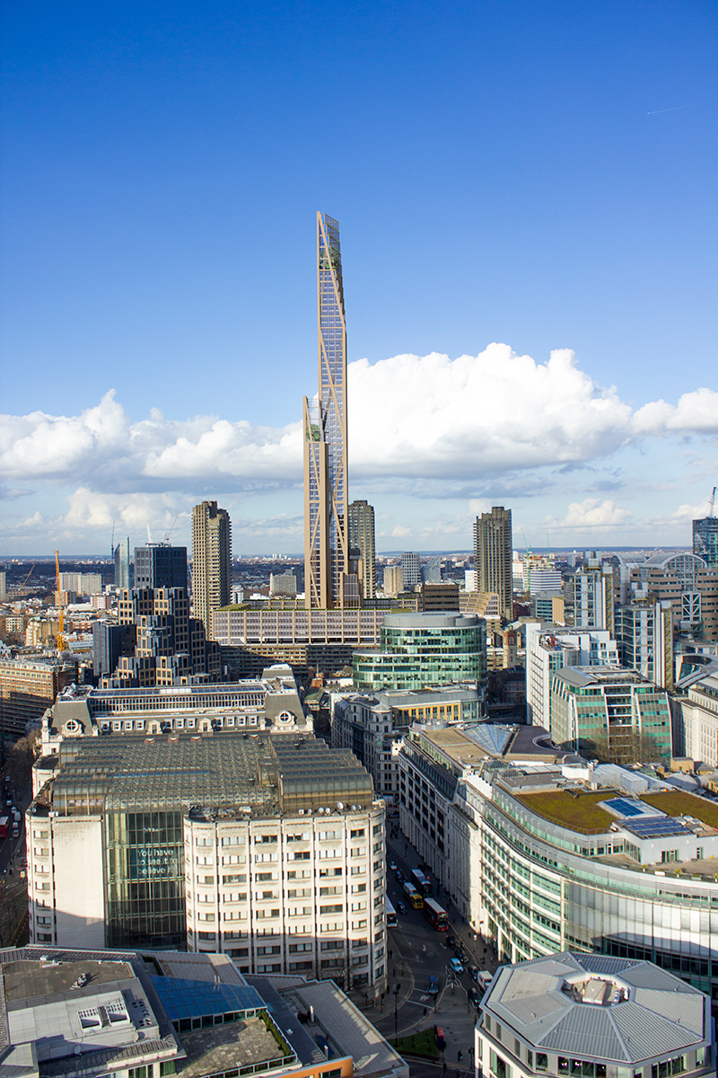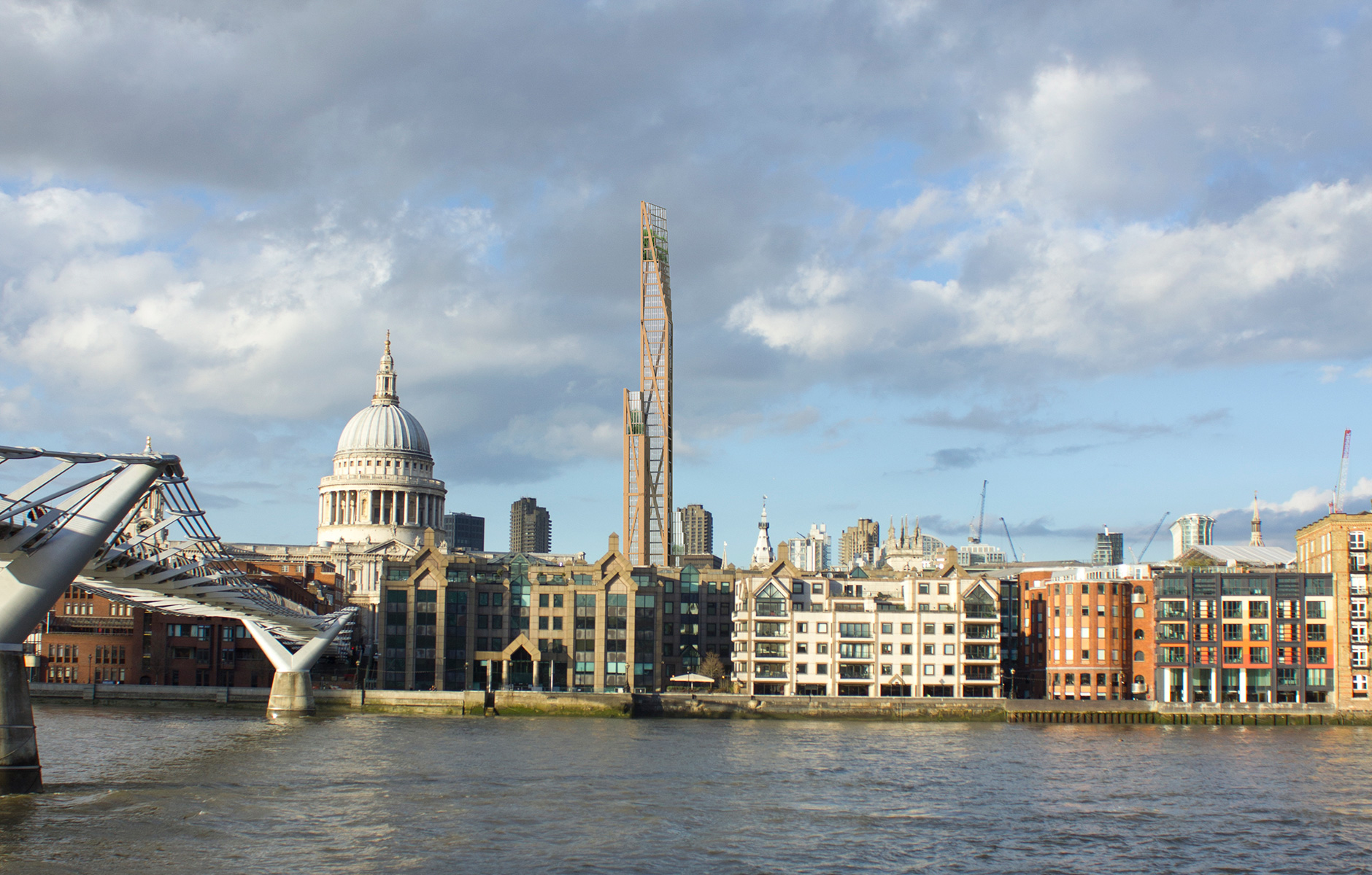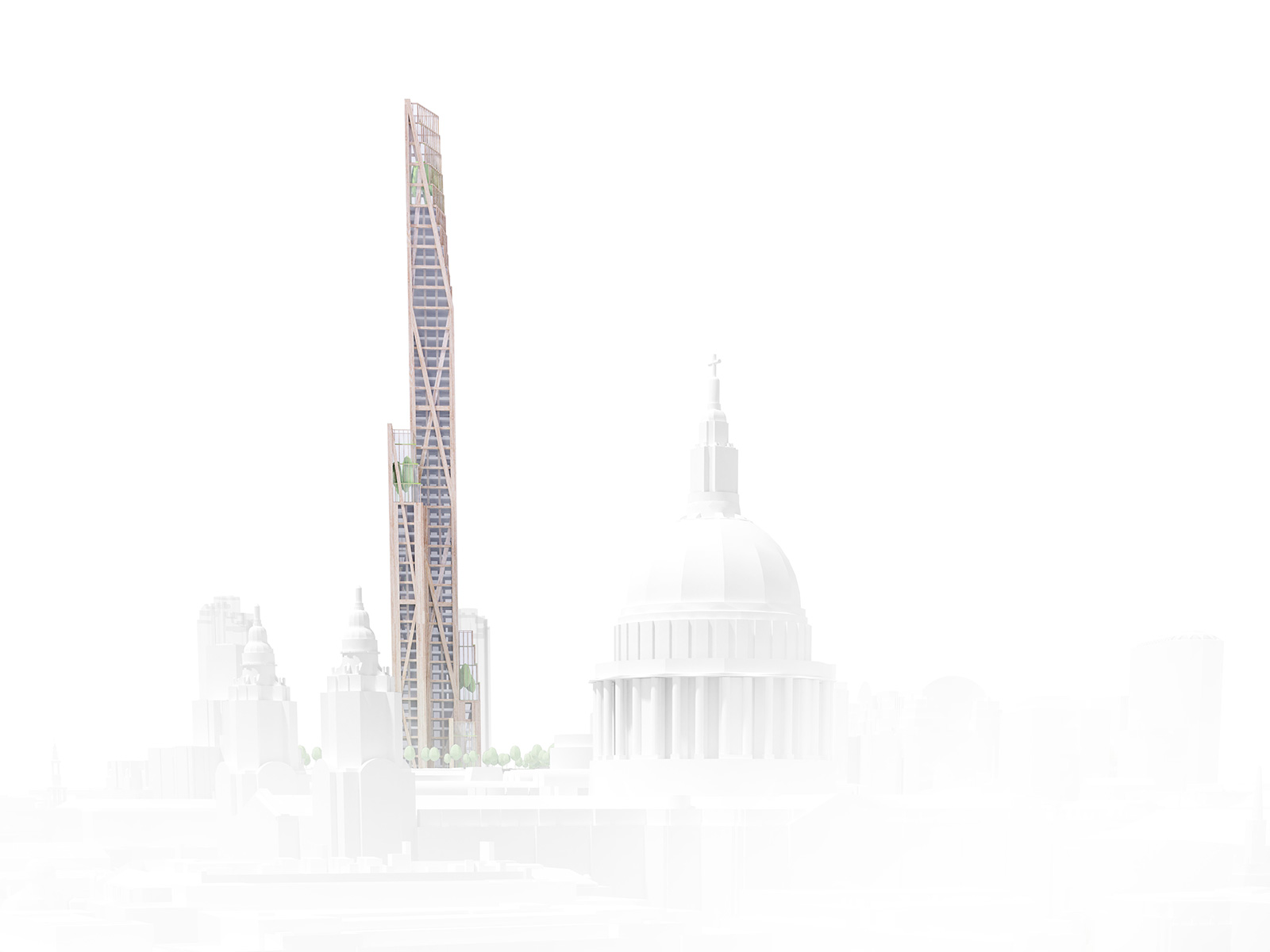 Träarkitekturen växer sig allt högre – i alla fall på arkitekternas CAD-skärmar. Ett av de senare förslagen är en 80 våningar hög skyskrapa, signerad PLP Architecture i London. Tanken är att skyskrapan ska stå i Barbican, centrala London. Forskare från Cambridge Department of Architecture har också deltagit i processen medan konstruktörsfirman Smith and Wallwork står för de bärande delarna.