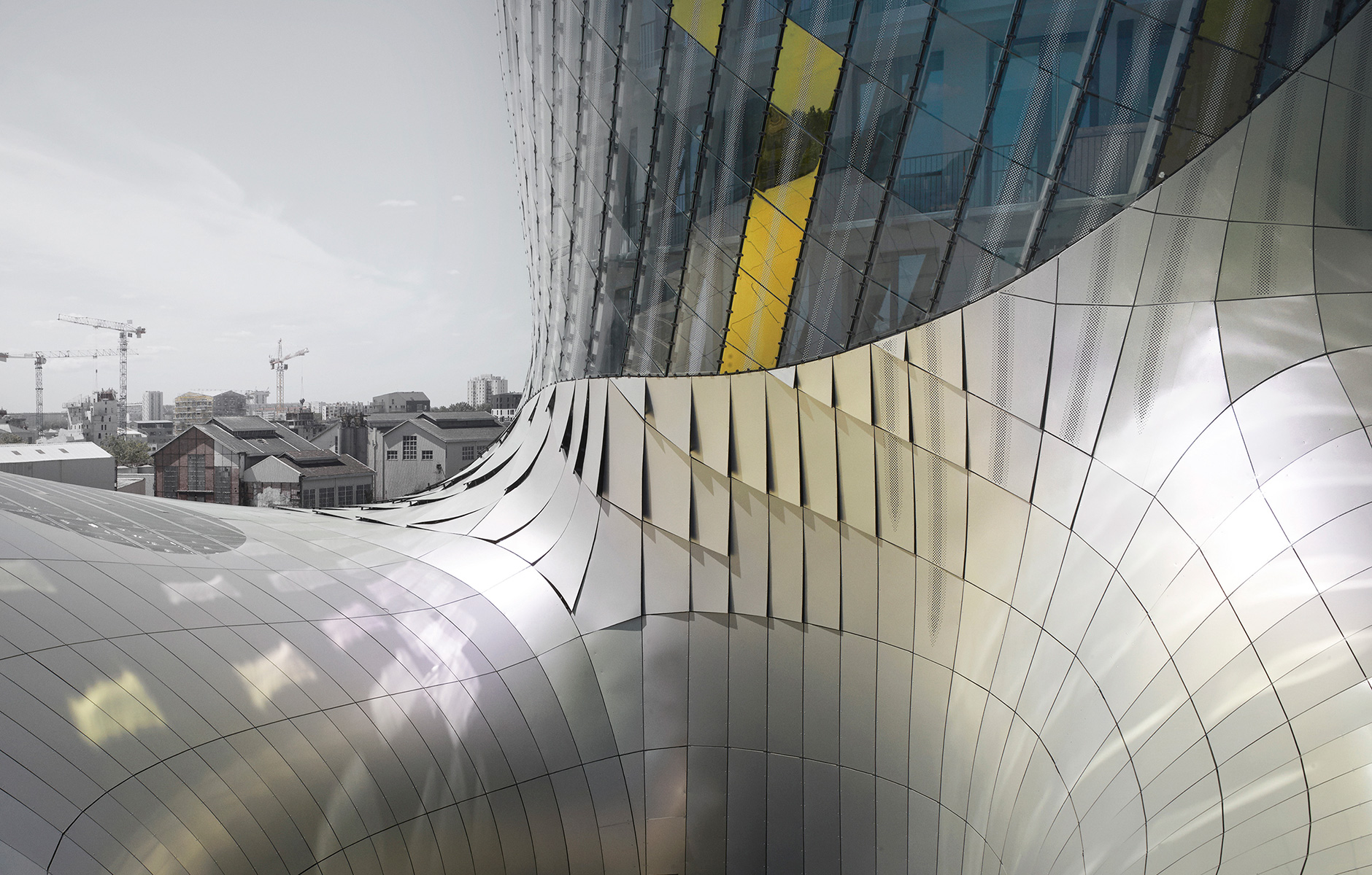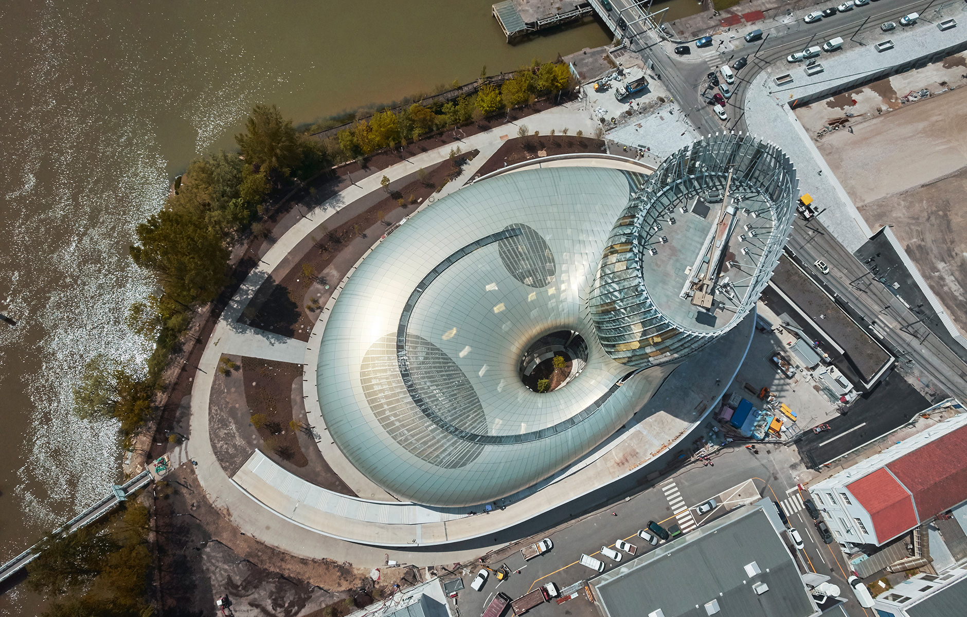 Länken som arkitekterna velat skapa kan mycket väl vara den gyllene fasaden i glas och aluminium. Den för en ständig dialog med floden Garonne i ett tonfall som förändrar sig beroende på väder och tid på dygnet. Helt klart klingar den också som ett eko från de ljusa kalkstensfasader som återfinns på många av Bordeaux gamla byggnader.