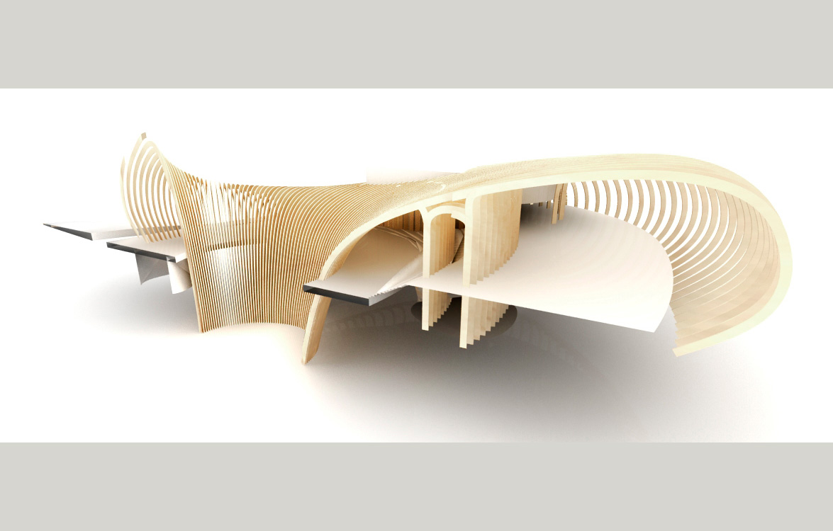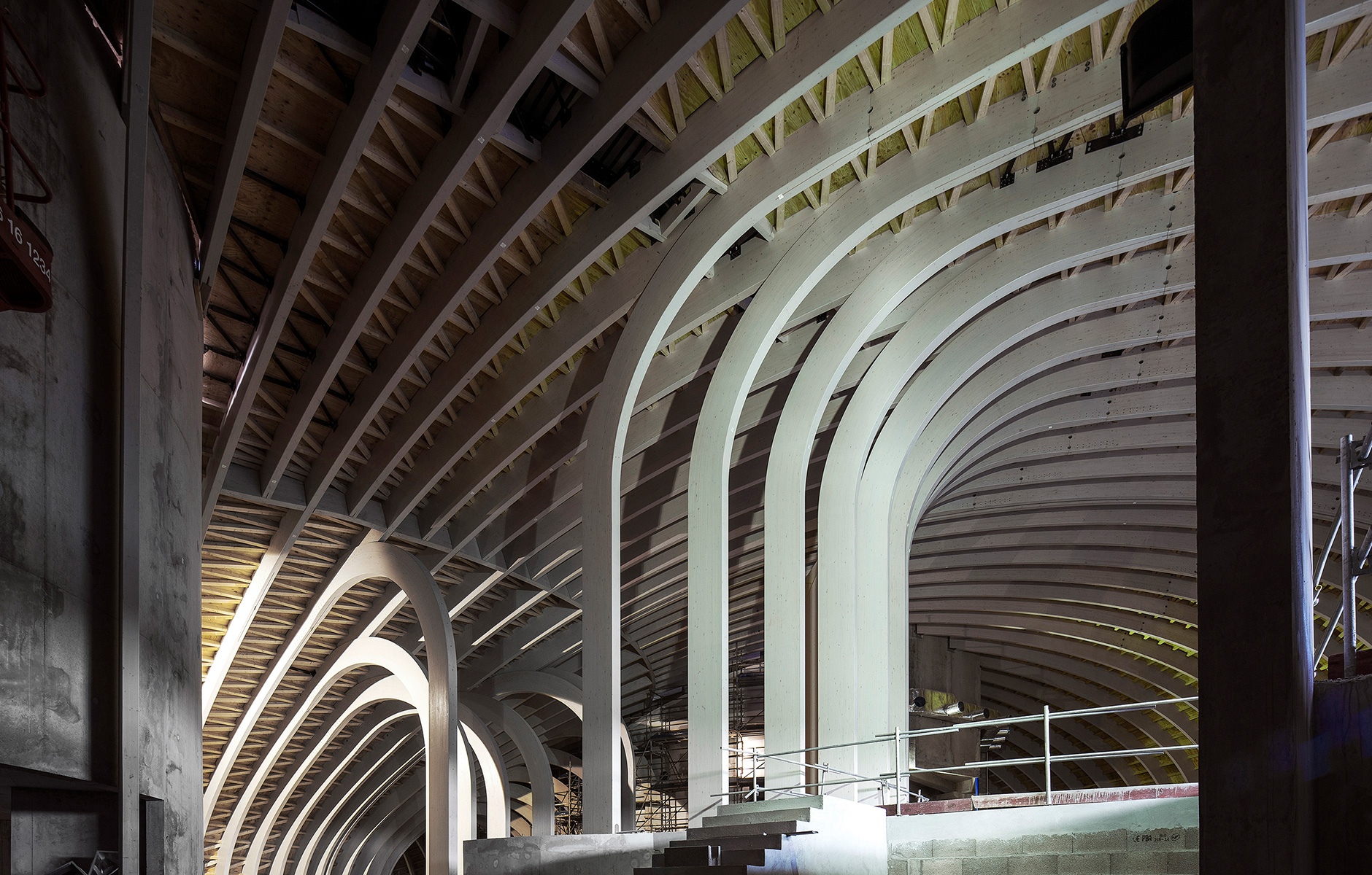 Bakom den avancerade träkonstruktionen står företaget Arbonis som är en del av teknikkonsultföretaget Vinci. Konstruktionen är tillverkad av limträ som genom avancerad CNC-teknik formats till undulerande bågar. Dessa bågar är inspirerade av både skeppsbyggnadsteknik och fartygsanatomi och ger byggnaden ett helt eget uttryck både in- och utvändigt.