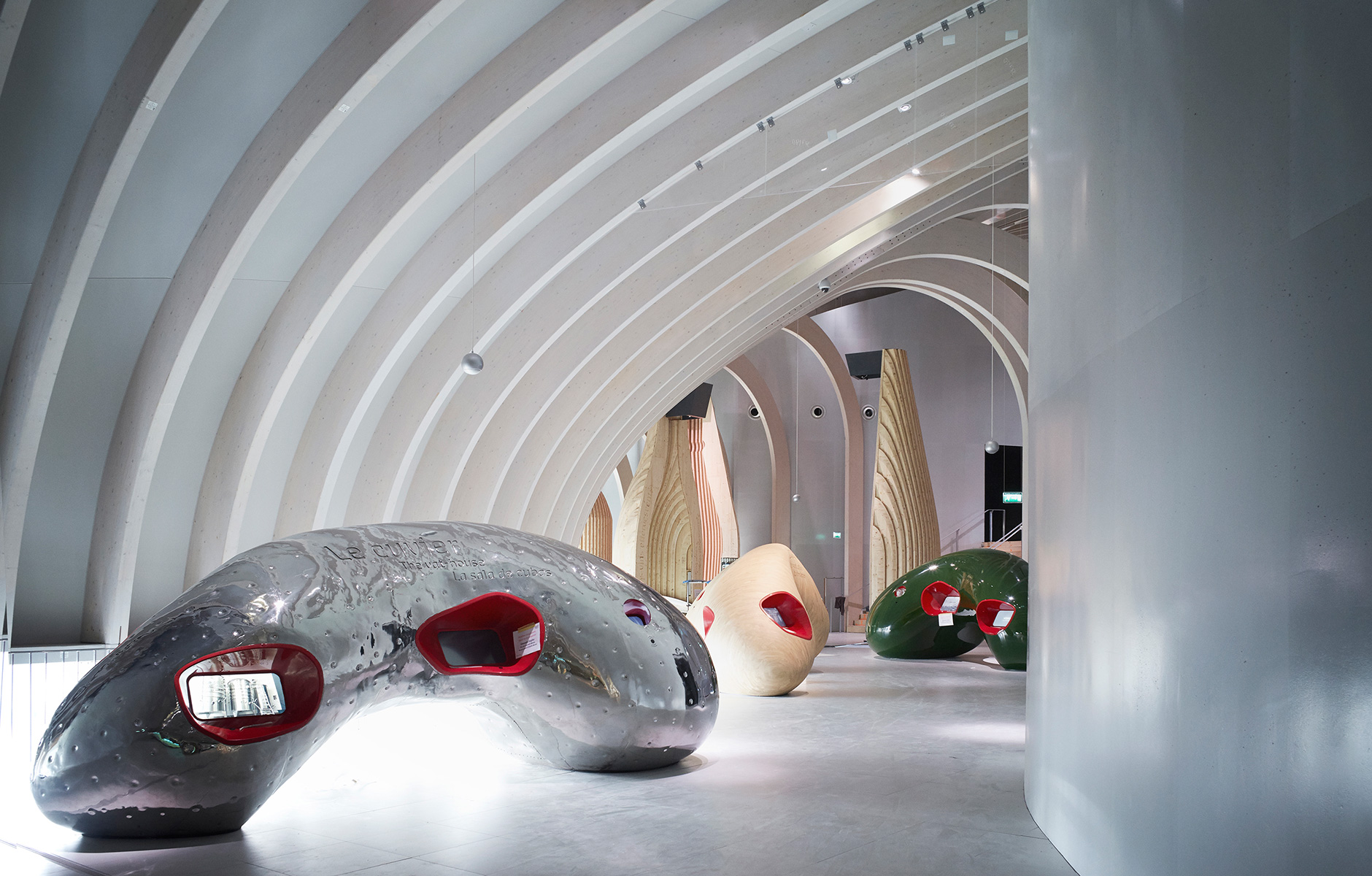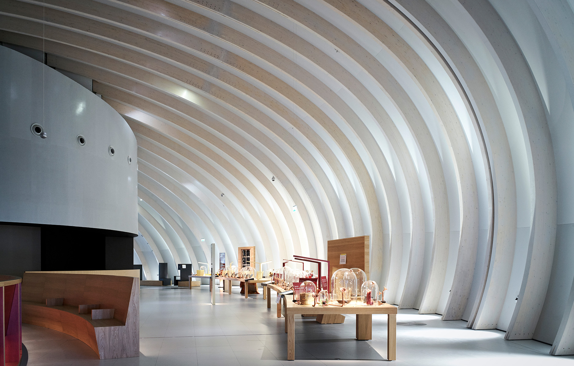De sensuellt rundande formerna i byggnadens exteriör präglar även interiören både i material och skala. Förutom att de skapar ett spännande skuggspel och djup till den 3 000 kvadratmeter stora permanenta utställningen på museets tredje våningsplan sätter bågarna i limträ dessutom fart på den vågrörelse som leder besökarna både framåt och uppåt i byggnaden. Med sin innovativa och uppslukande scenografi är det den permanenta utställningen som är byggnadens pulserande hjärta. Här är träkonstruktionen täckt med 200 kvadratmeter brandskyddad plywood. Tack vare den kreativa ljussättningen förmedlar taket känslan av att man som besökare befinner sig under en bar himmel med varierande molnighet. Symboliken och kopplingen till vinproduktion är tydlig, eftersom väder och vind ofta är en avgörande faktor som betyder skillnaden mellan en bra och dålig årgång.