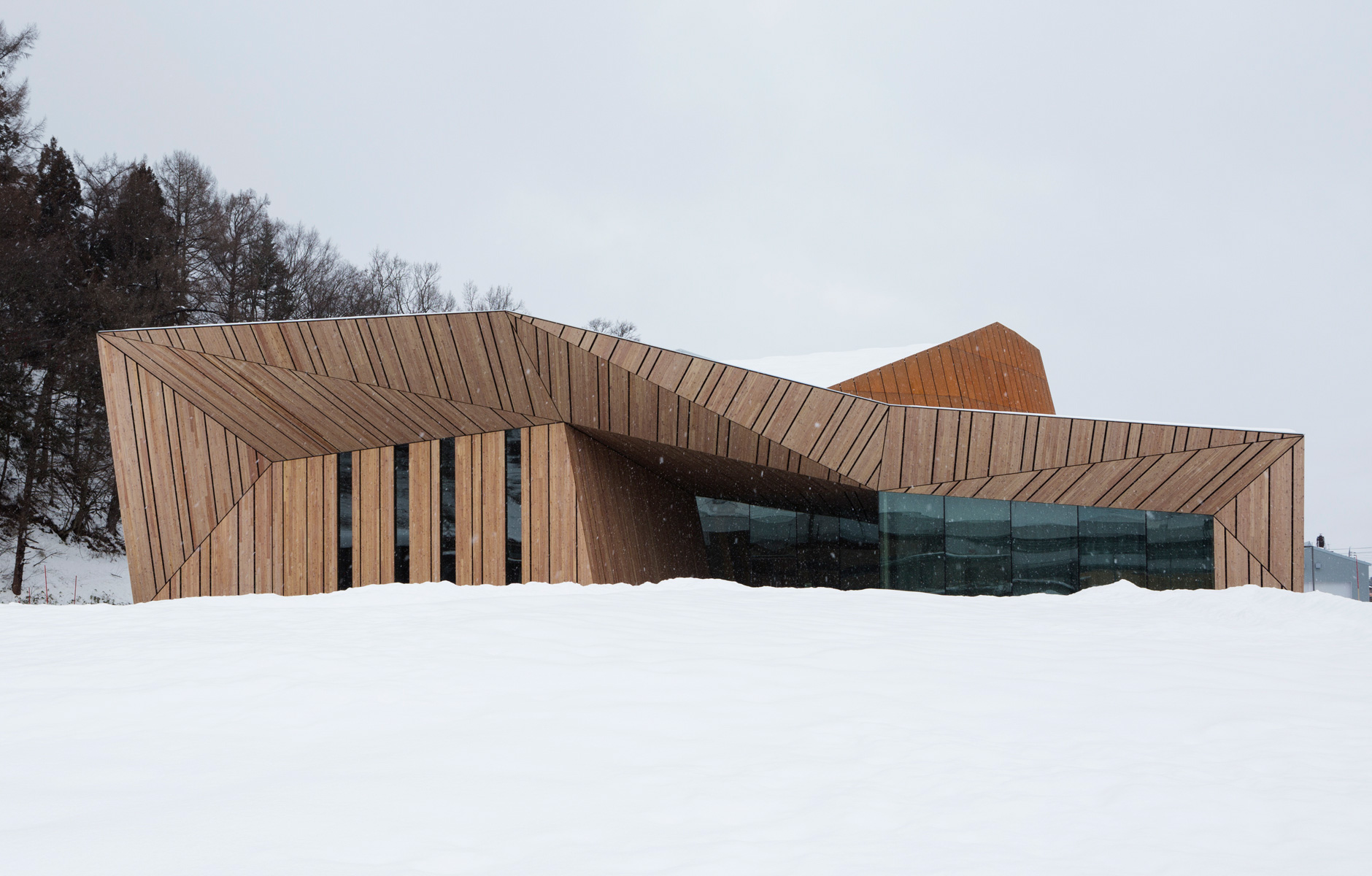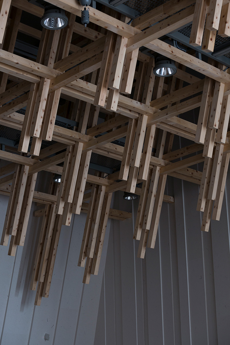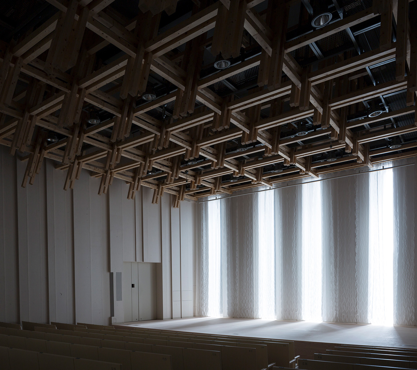 Japansk lärk ingår också i de bärande delarna, inte minst den spektakulära takstolskonstruktionen i de två salar som är tänkta för scenuppträdanden. De är sammanbundna av en takkonstruktion av limmade balkar – också de av lärk. Det anknyter till en lokal byggnadstradition där gångar mellan husen – gangi – skyddar invånarna från det karga vinterklimatet. I den tredje huskroppen finns ett mindre utrymme tänkt att användas som samlingslokal. Taket är uppbyggt av nio lager plankor av furu, lagda korsvis över en kupolformad mall. Plankorna går över hela takets radie – de längsta är 20 meter långa. Det ger en stark och lätt takkupol som dessutom påminner om en traditionell japansk stråhatt. Träpelarna är tillverkade av kl-trä. Även väggarna är byggda i trä, om än med mer konventionell regelteknik.«