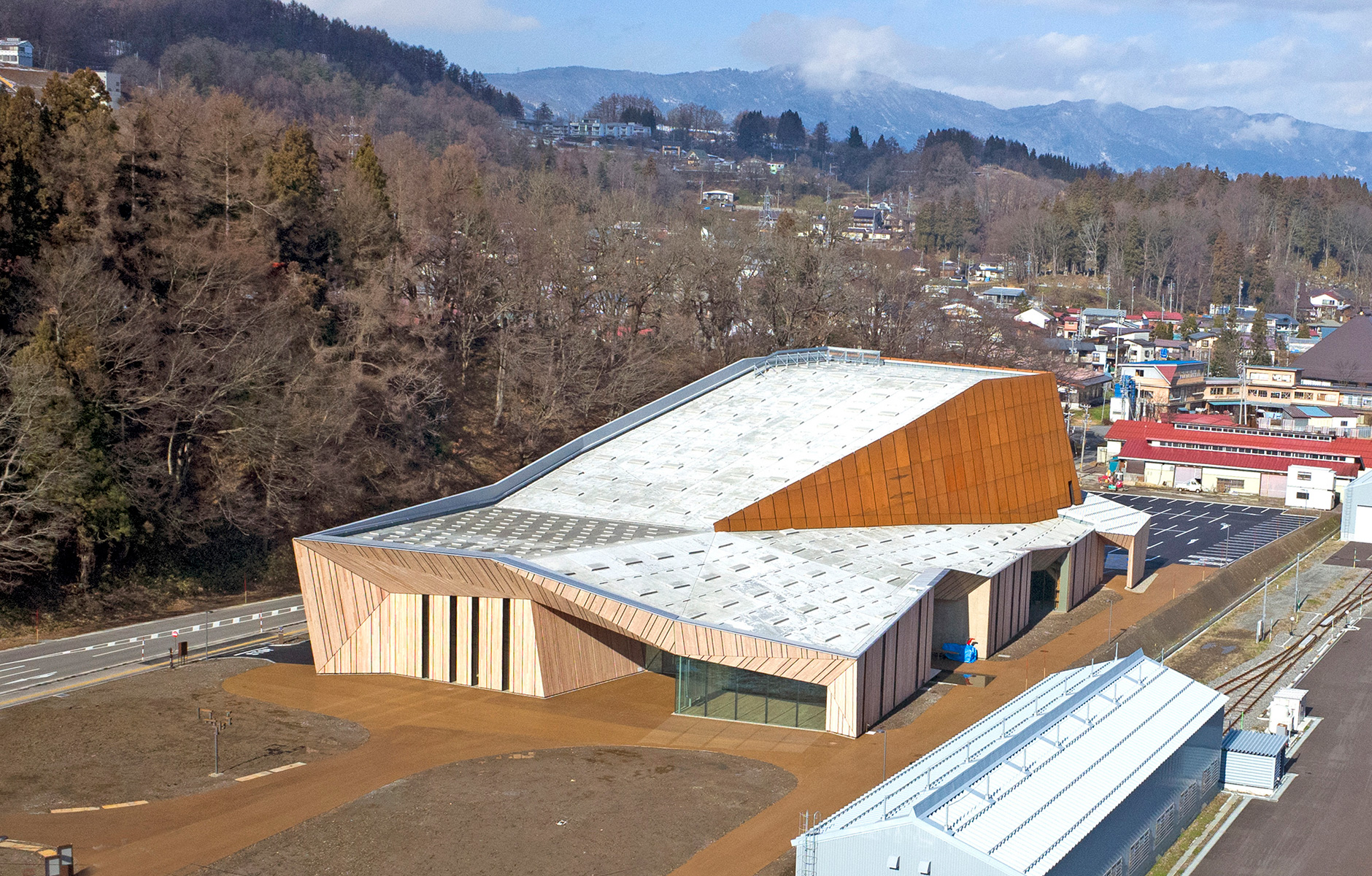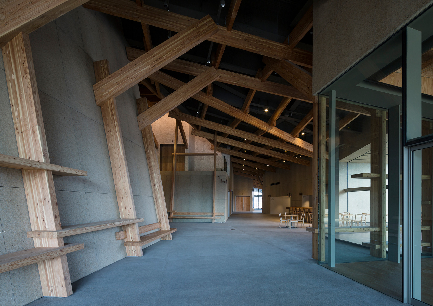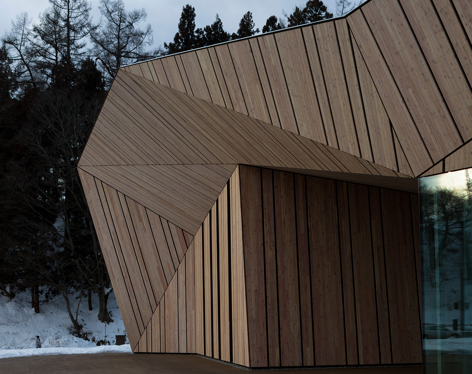 Japansk lärk ingår också i de bärande delarna, inte minst den spektakulära takstolskonstruktionen i de två salar som är tänkta för scenuppträdanden. De är sammanbundna av en takkonstruktion av limmade balkar – också de av lärk. Det anknyter till en lokal byggnadstradition där gångar mellan husen – gangi – skyddar invånarna från det karga vinterklimatet. I den tredje huskroppen finns ett mindre utrymme tänkt att användas som samlingslokal. Taket är uppbyggt av nio lager plankor av furu, lagda korsvis över en kupolformad mall. Plankorna går över hela takets radie – de längsta är 20 meter långa. Det ger en stark och lätt takkupol som dessutom påminner om en traditionell japansk stråhatt. Träpelarna är tillverkade av kl-trä. Även väggarna är byggda i trä, om än med mer konventionell regelteknik.«