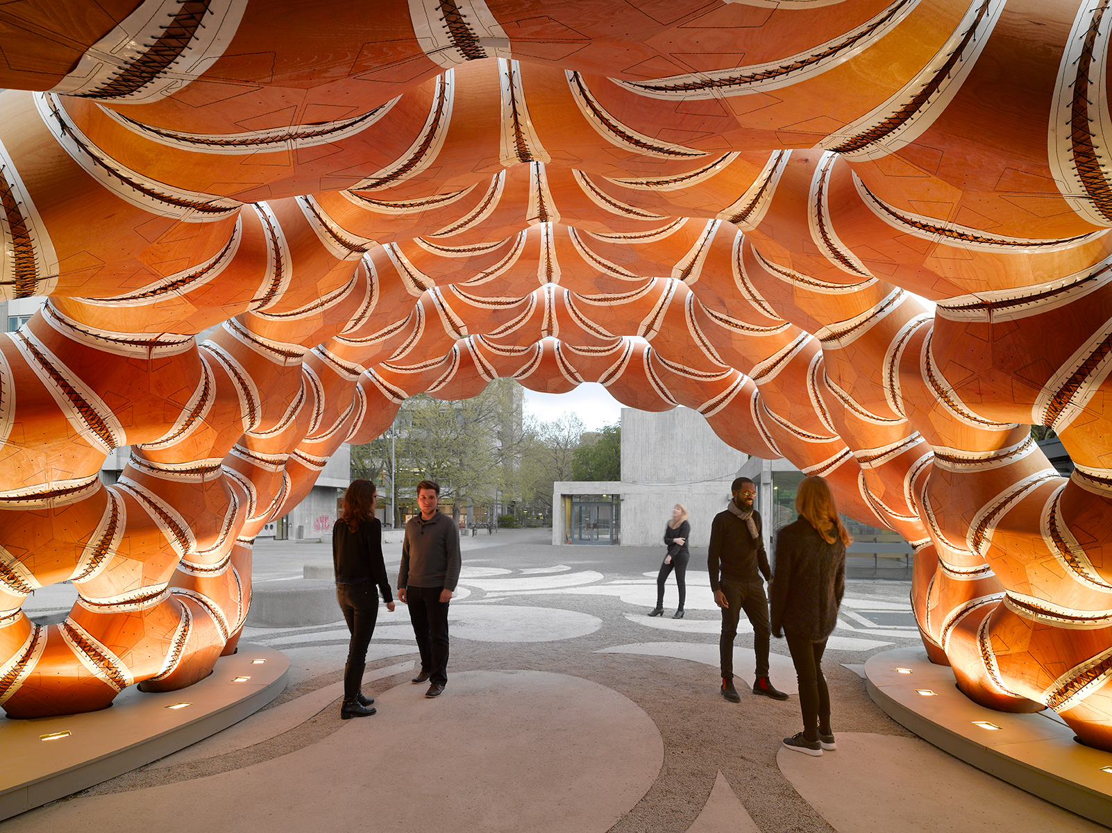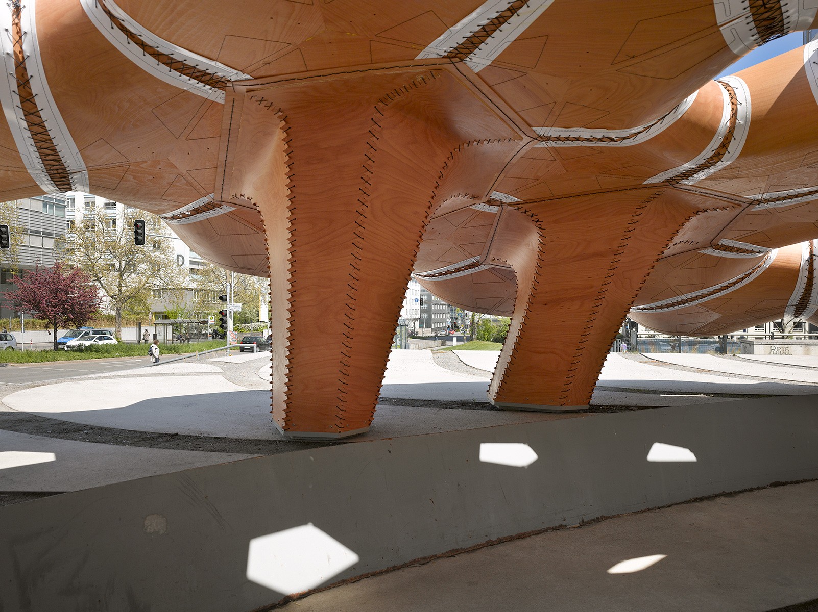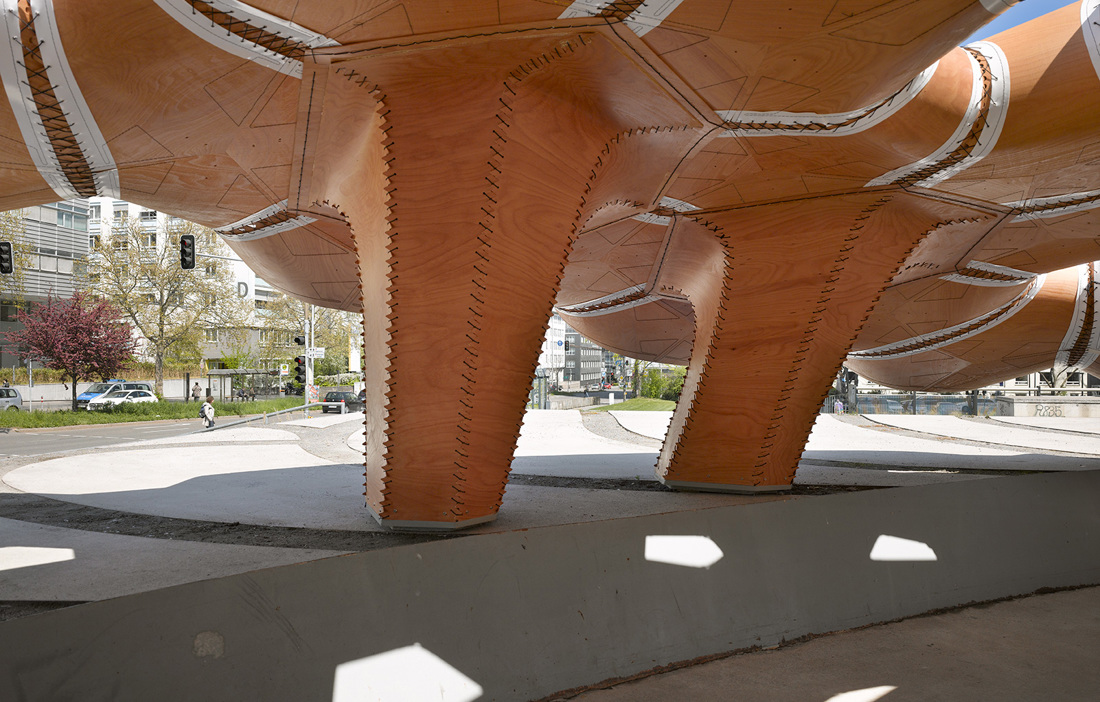 Paviljongen är konstruerad av individuellt utformade enheter uppbyggda av tunn bokplywood som skurits ut med hjälp av robotar. I stället för att laminera skivorna med lim fixeras de i sin välvda form genom att sys ihop med varandra med hjälp av en robotkontrollerad industri-symaskin.«