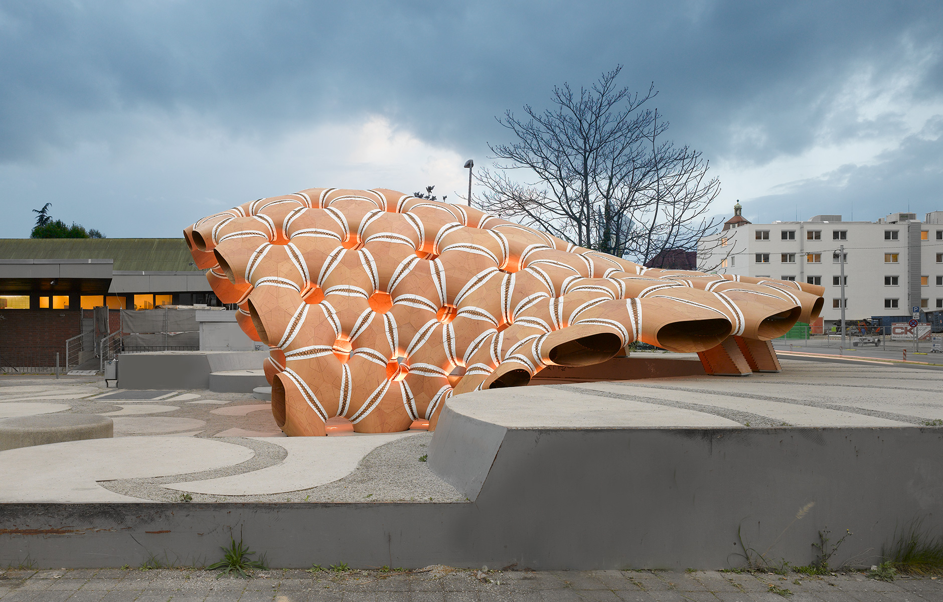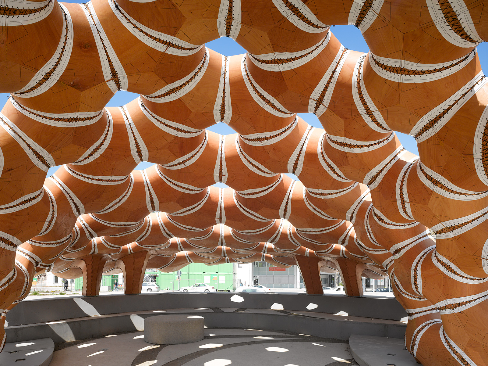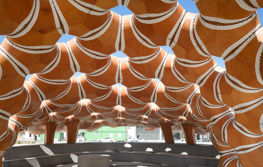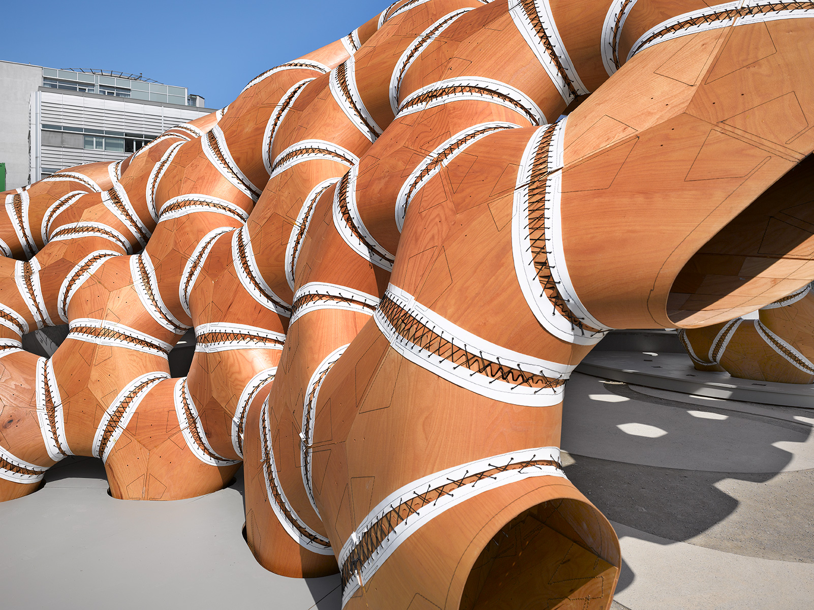 Paviljongen är konstruerad av individuellt utformade enheter uppbyggda av tunn bokplywood som skurits ut med hjälp av robotar. I stället för att laminera skivorna med lim fixeras de i sin välvda form genom att sys ihop med varandra med hjälp av en robotkontrollerad industri-symaskin.«