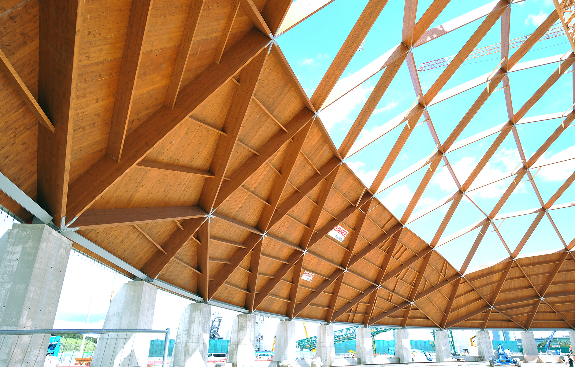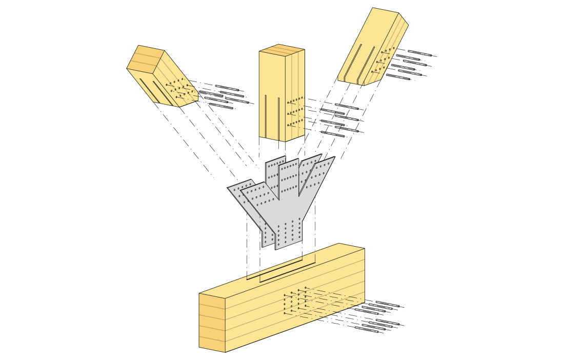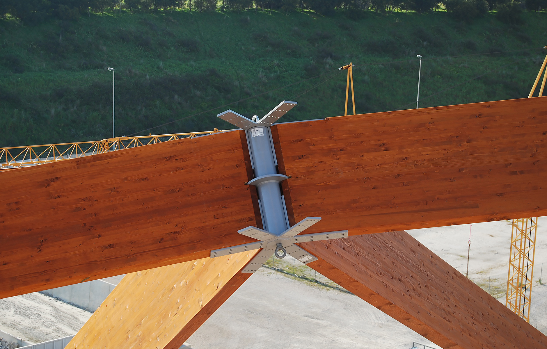 Denna teknik har nyligen använts vid konstruktionen av ett av Europas största träprojekt, två tvillingkupoler för kollagring i syditalienska Brindisi. Kupolerna har en geodetisk geometri med en diameter på 145 meter. I drift är knutpunkterna i en kupol belastade huvudsakligen i dragning och/eller tryck. Å andra sidan utsätts samma knutpunkter för stora moment under monteringsfasen (figur 6). För att kunna klara de stora momenten i knutpunkterna, användes stålbeslag med sneddragna parallella träskruvar enligt samma princip som i figur 5a.