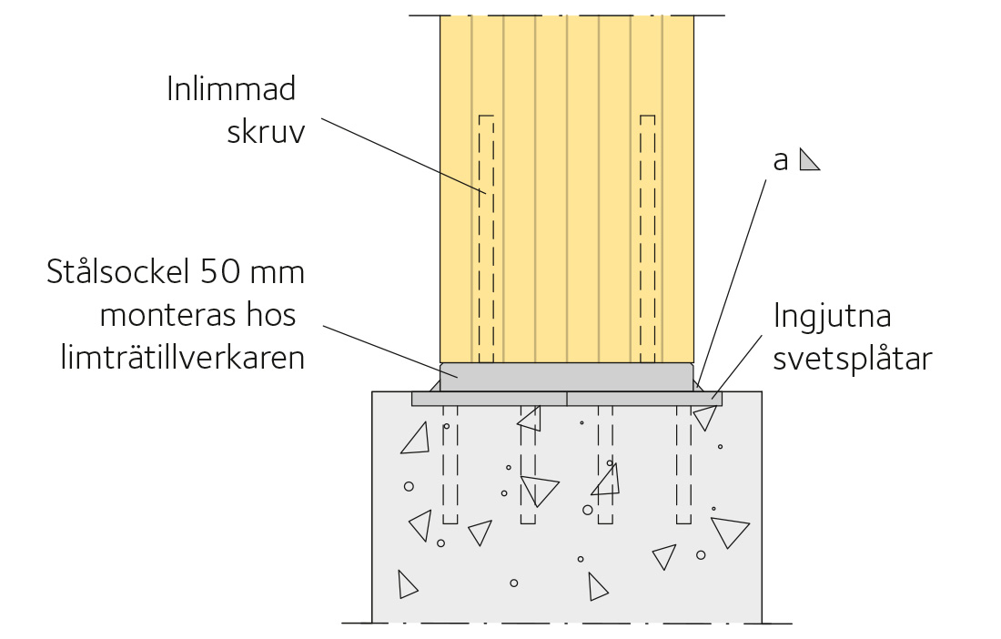 Inlimmade skruvar – när man använder inlimmade skruvar är infästningen helt dold. Därför är denna förbandstyp mycket god ur brandteknisk synvinkel. De enskilda inlimmade skruvarna kan överföra relativt stora drag- och tryckkrafter. Däremot är kravet på avstånd mellan skruvarna samt mellan skruvar och den yttre träsidan ganska restriktiva. Det innebär att bara en begränsad del av trätvärsnittet kan användas för inlimning av skruvar. Detta resulterar i att lastkapaciteten ofta är mindre här än till exempel i förband med inslitsade plåtar och dymlingar. Det finns träkonstruktioner, bland annat i Schweiz, där man har använt inlimmade skruvar i kombination med mycket höghållfasta träslag som bok och ask. I och med valet av dessa träslag har man kunnat reducera centrumavståndet mellan de inlimmade skruvarna samt kunnat nyttja högre hållfasthetsvärden. På så sätt har man kunnat konstruera träfackverk med imponerande dimensioner. Inlimmad skruv får inte användas i konstruktioner i klimatklass 3 (utomhuskonstruktioner) eller i konstruktioner utsatta för dynamiska laster (figur 4).