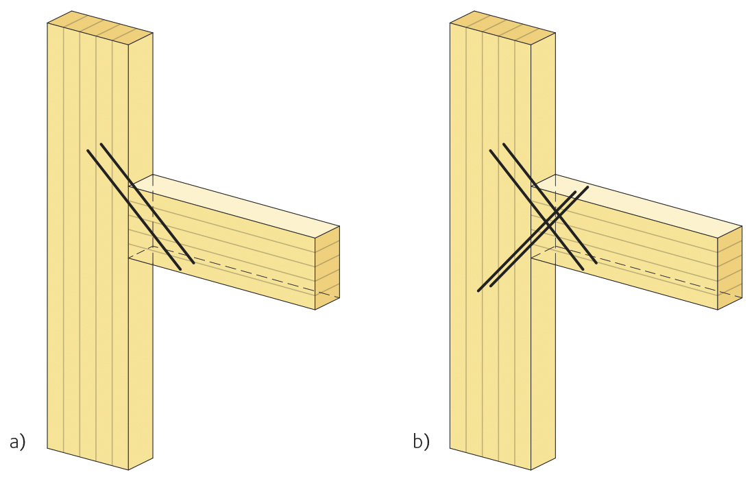 Snedskruvning vid ett förband kan ske antingen med parallella träskruvar eller med kryssdragna (parvisa) träskruvar (figur 5). Vid figur 5a har två parallella snedställda träskruvar använts, och vid figur 5b har fyra parvist snedställda träskruvar använts. När balken belastas med nedåtriktade laster blir båda skruvarna i det första fallet dragna, medan skruvarna i det andra blir parvist dragna och parvist tryckta.