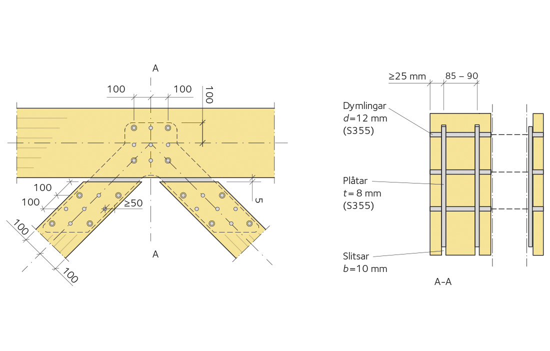 Inslitsade stålplåtar och dymlingar – den här förbandstypen består av en eller flera stålplåtar som förs in i försågade slitsar i trästyckena samt ett antal ståldymlingar placerade i förborrade hål, tvärs genom slitsarnas plan. Det finns även självborrande dymlingar, i regel med 7 millimeter i diameter i kombination med 5 millimeter tjocka stålplåtar. Generellt ökar lastkapaciteten per dymling markant allteftersom antalet inslitsade plåtar ökar. Denna typ av förband är mycket effektiv när det gäller lastupptagning. I dagsläget är det den vanligaste typen av förband vid överföring av stora laster mellan träelement. Förbandet lämpar sig ungefär lika bra för att överföra såväl drag- som tryckkrafter. Figur 2 visar utformningsprincipen av en fackverksknutpunkt med ett förband bestående av två inslitsade plåtar och flera dymlingar.