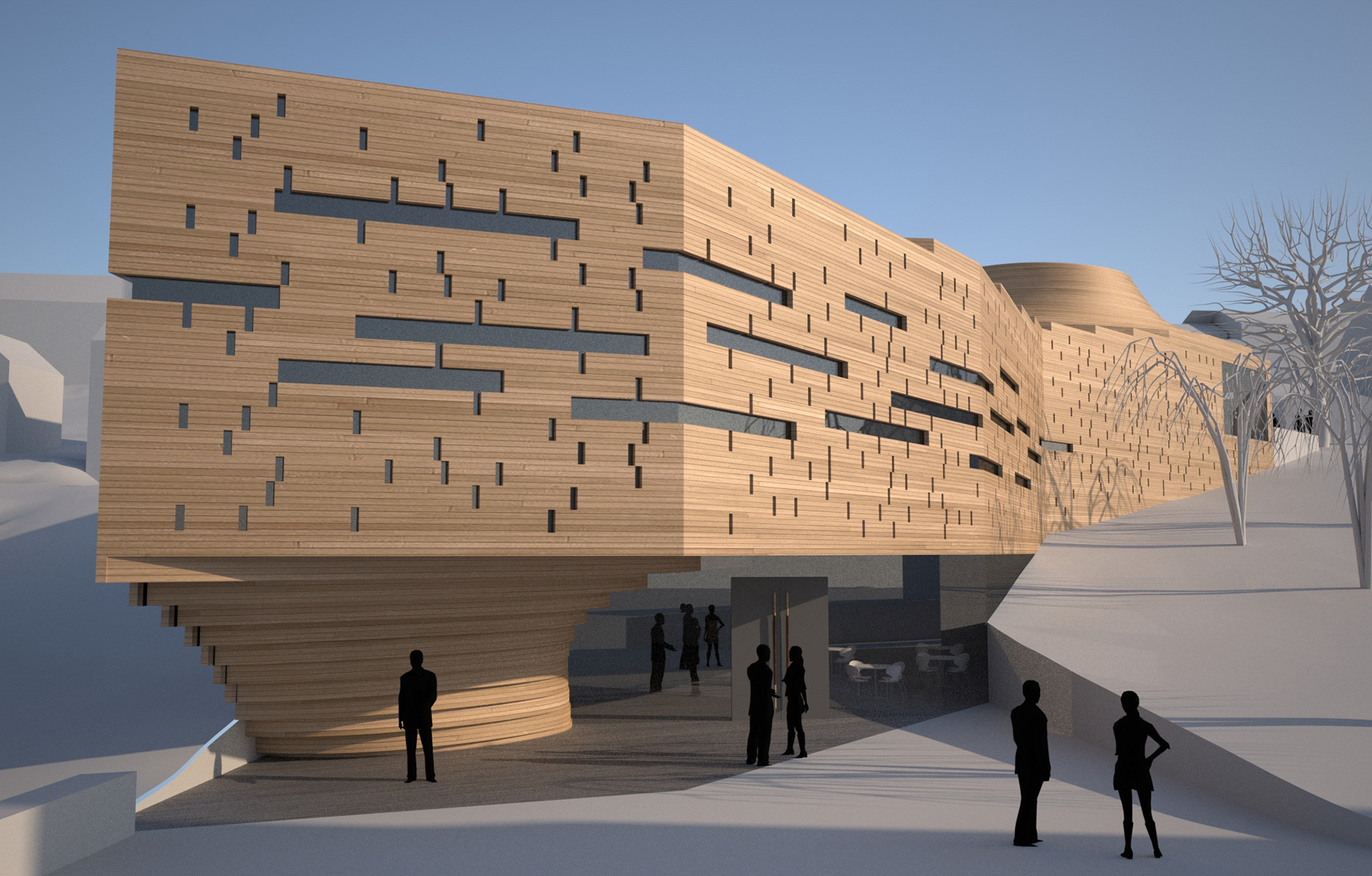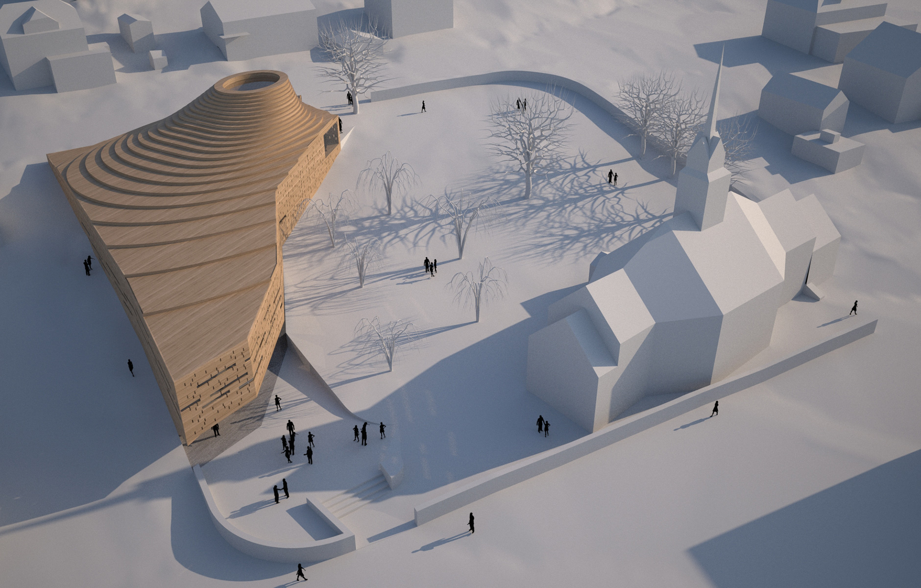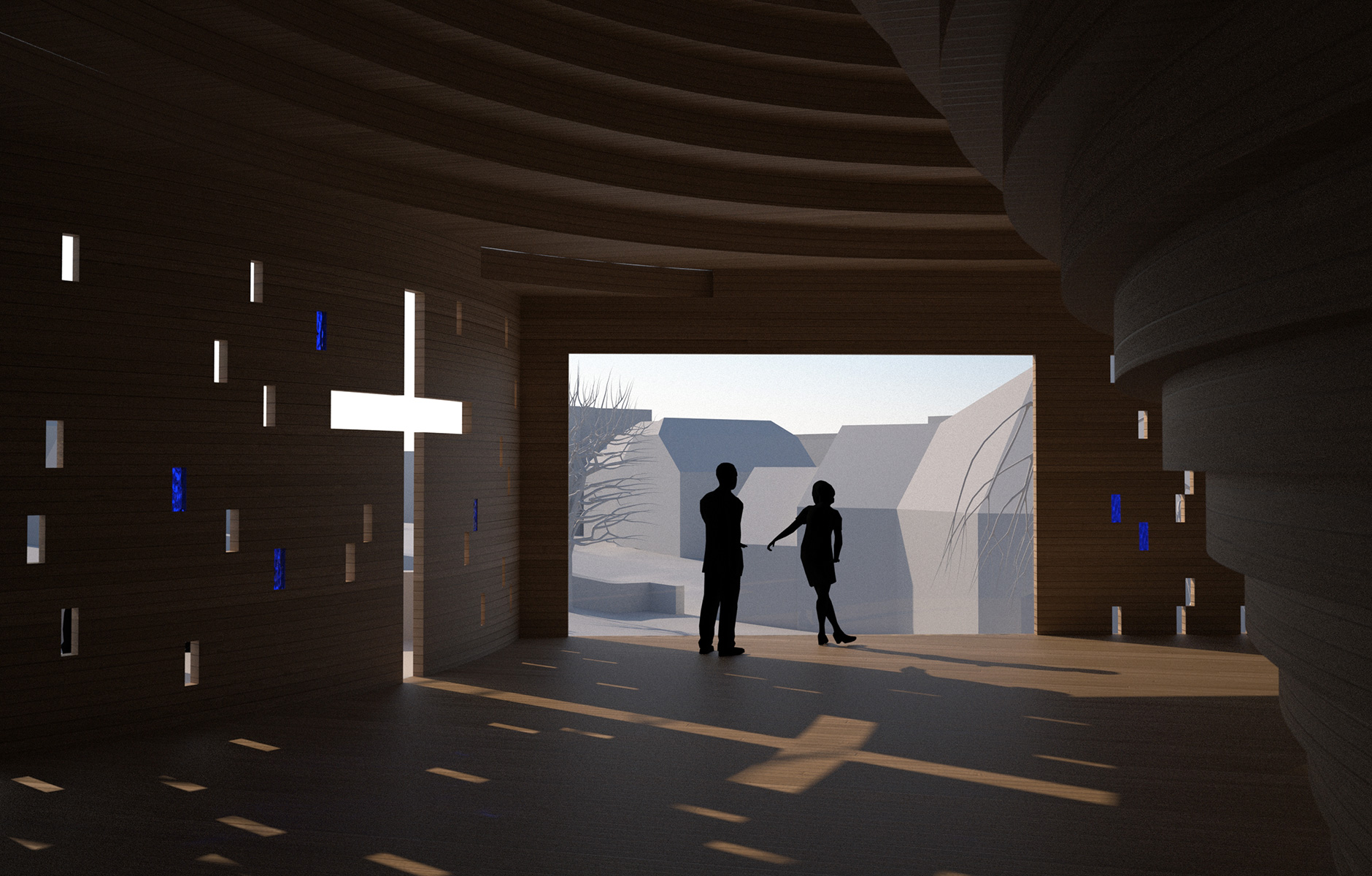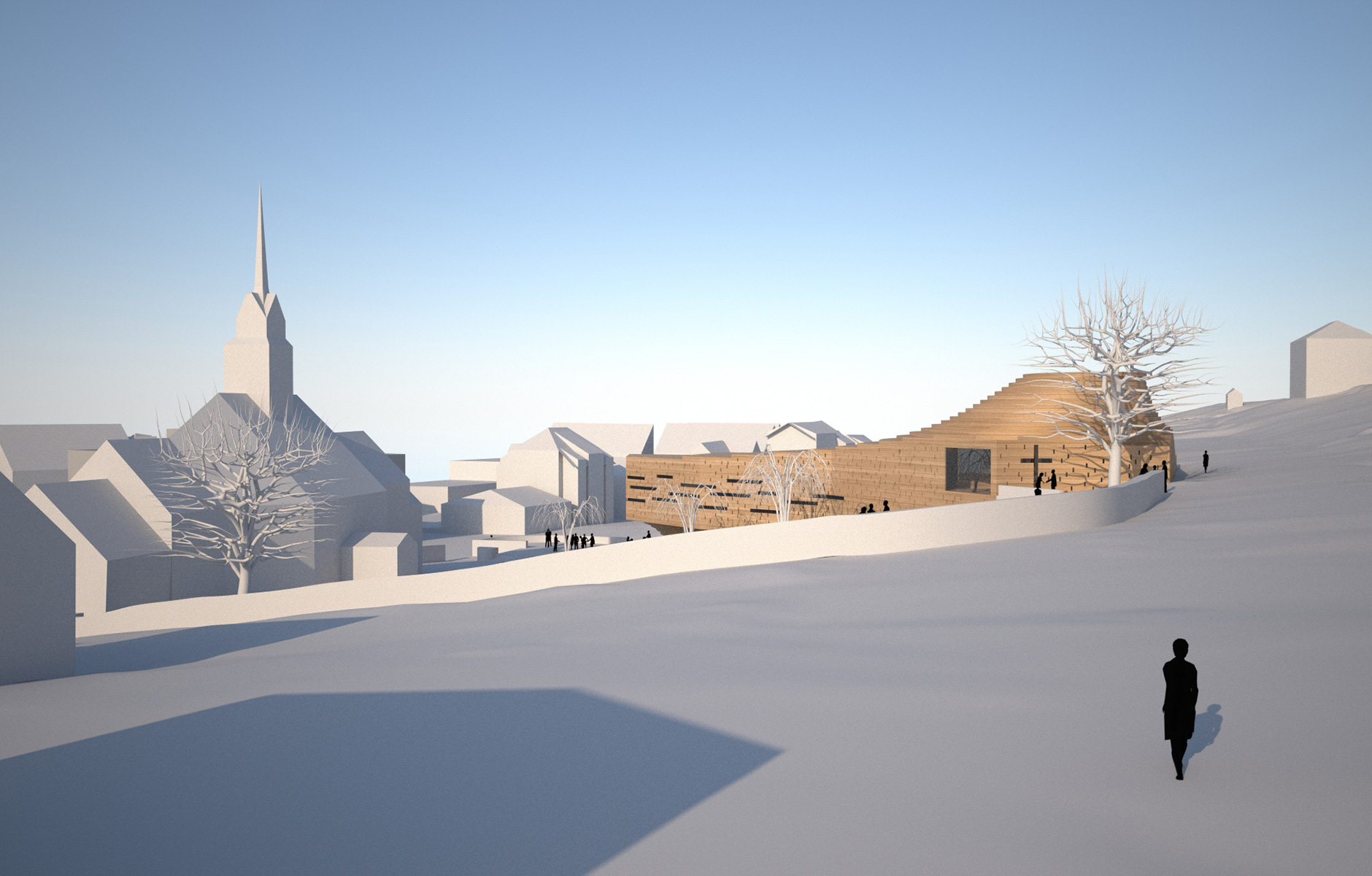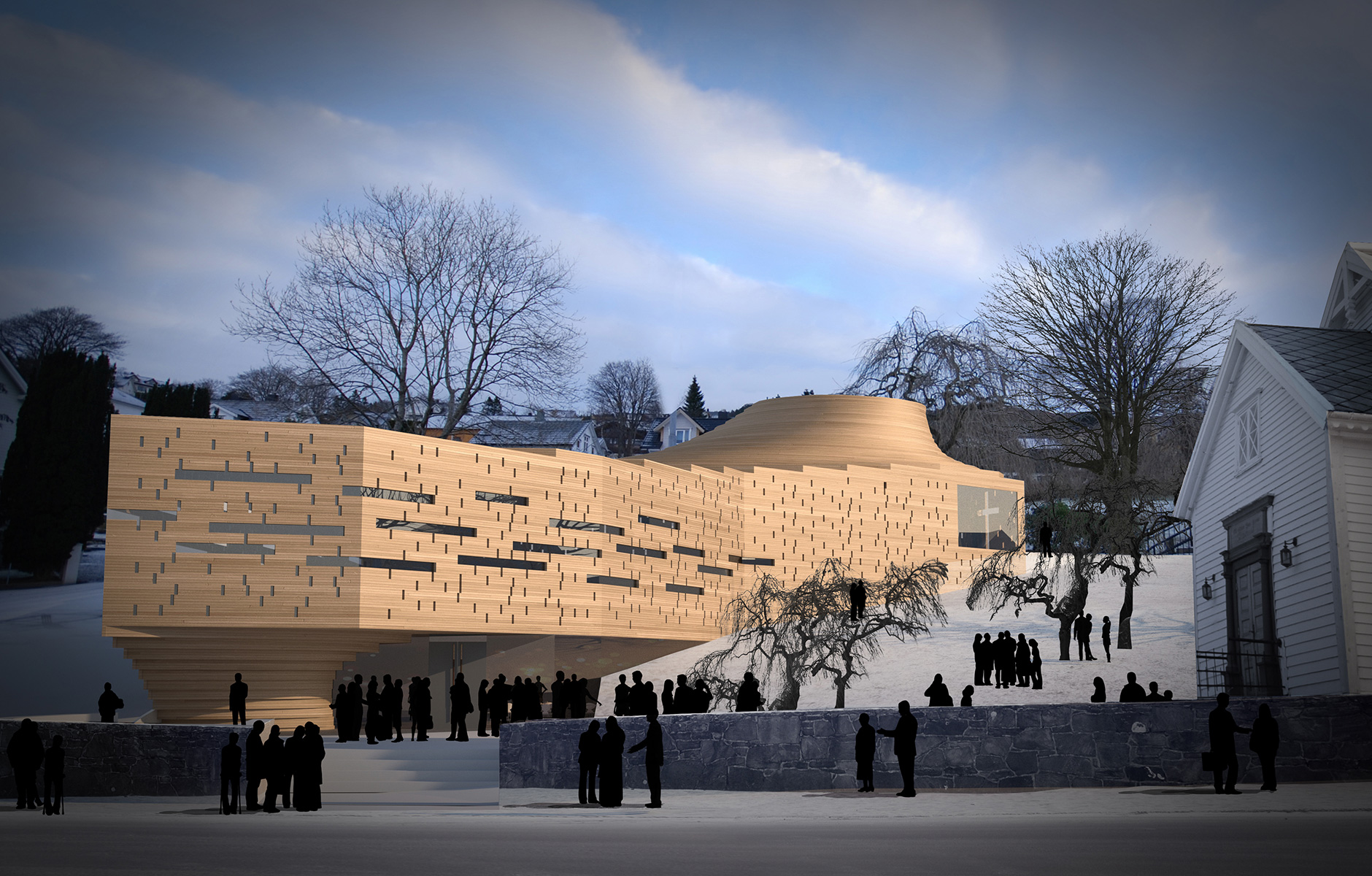 Excelsior är latin och betyder ungefär »ständigt uppåt« eller »ännu högre«. Det är också namnet på det vinnande bidraget för en ny träkyrka signerad de norska stjärn-arkitekterna Snøhetta. Kyrkan ska ligga intill den befintliga 1800-talskyrkan – även den i trä – i den lilla norska staden Ulsteinvik och kommer att fylla flera funktioner: förutom ett större kyrkorum finns här administrationslokaler och högst upp ett litet kapell. Arkitekterna tänker sig att bygget ska utföras i en »tårtkonstruktion« där de nedre lagren bär upp de övre. Allt ska utföras med massiva träskivor, men vilket träslag som ska användas och hur det hela ska fogas ihop vill arkitekterna än så länge inte uttala sig om. Däremot berättar de gärna om namn-valet: »I kyrkorummet finns en horisontell axel som förbinder jorden med himlen genom den stora öppningen i taket«, skriver Snøhetta på sin webbplats.