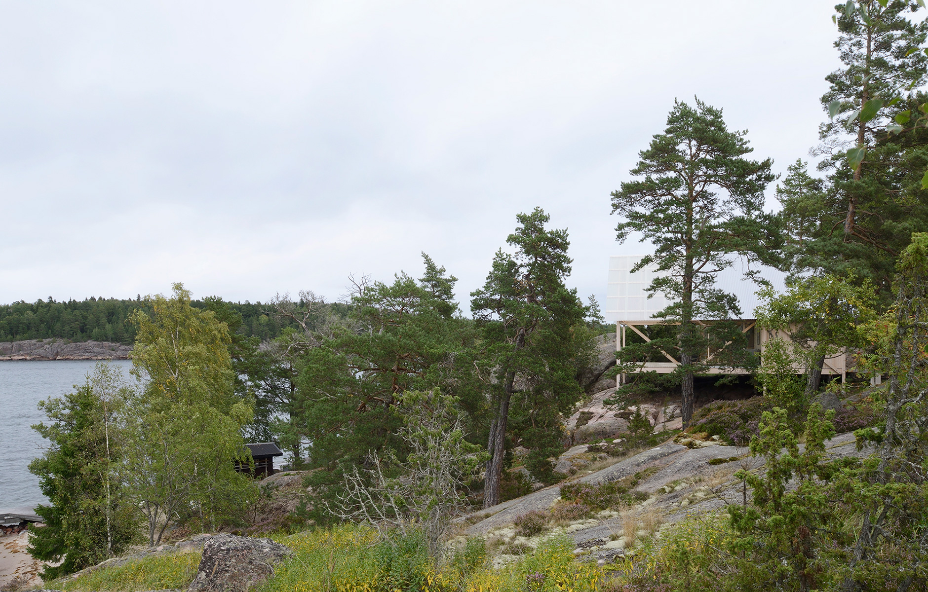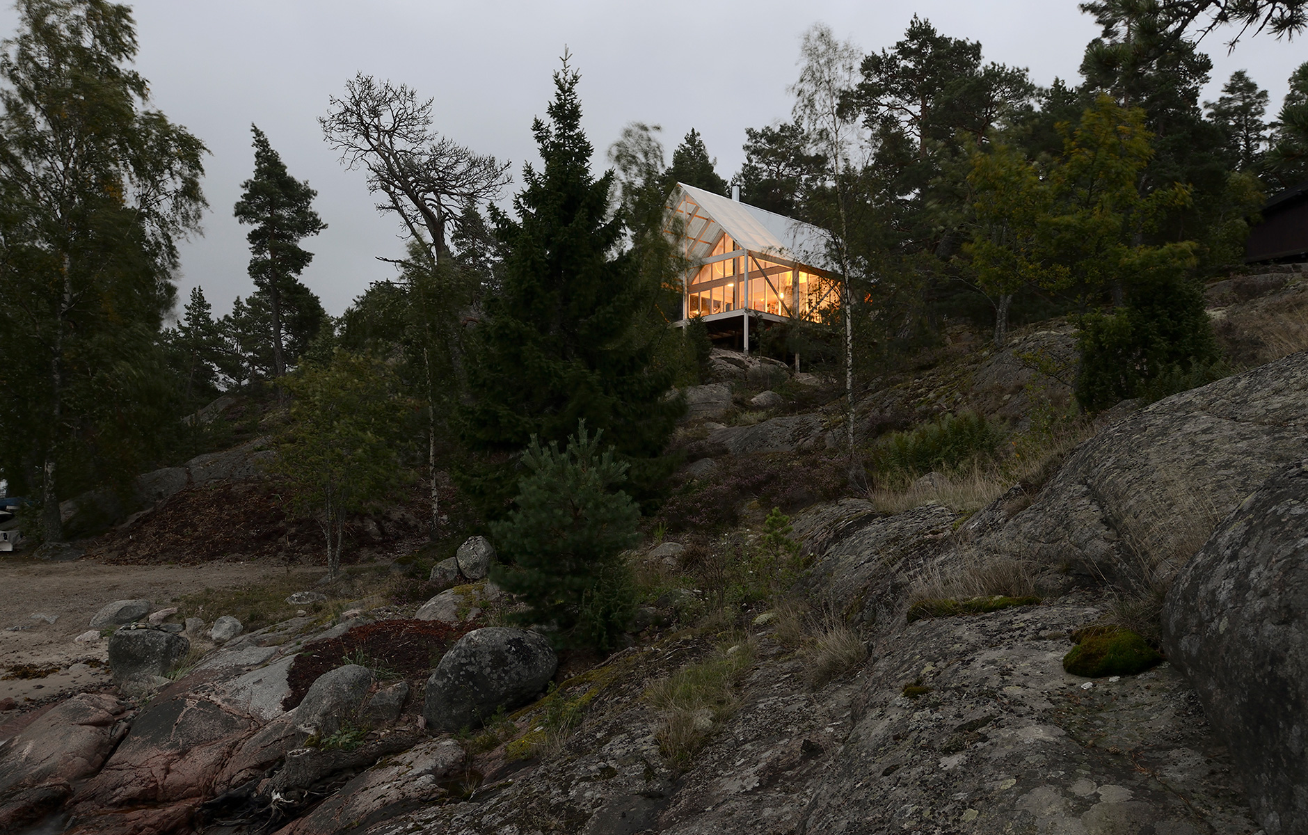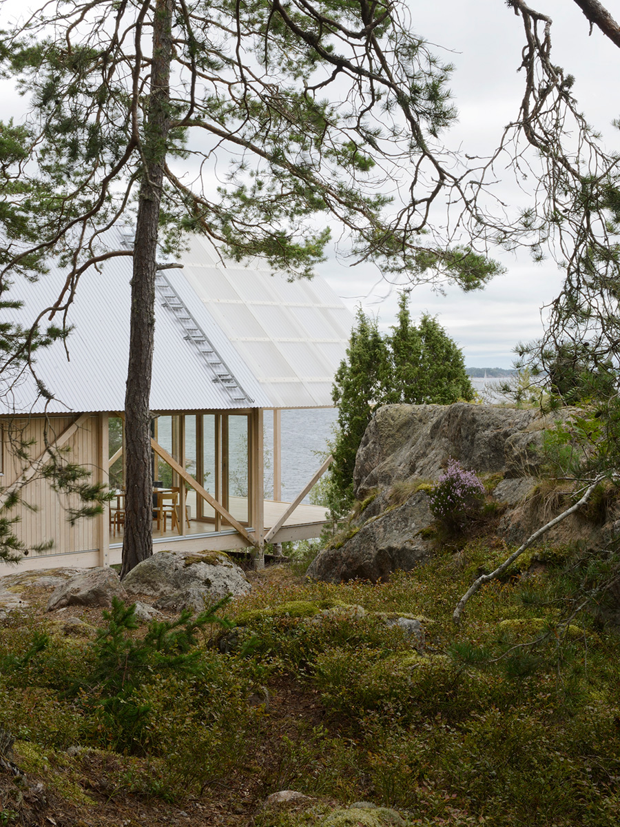Arrhov Frick Arkitektkontor fick i uppdrag att bygga en liten sommarstuga på en begränsad yta. Den bergiga tomten täckt av vindpinad furu och ljung gav inspiration till en avskalad men ändå ombonad stuga. Viggsö är en ö utan vägar och fast förbindelse i Stockholms mellersta skärgård. Alla byggnadsdelarna skulle gå att frakta och förflytta effektivt.