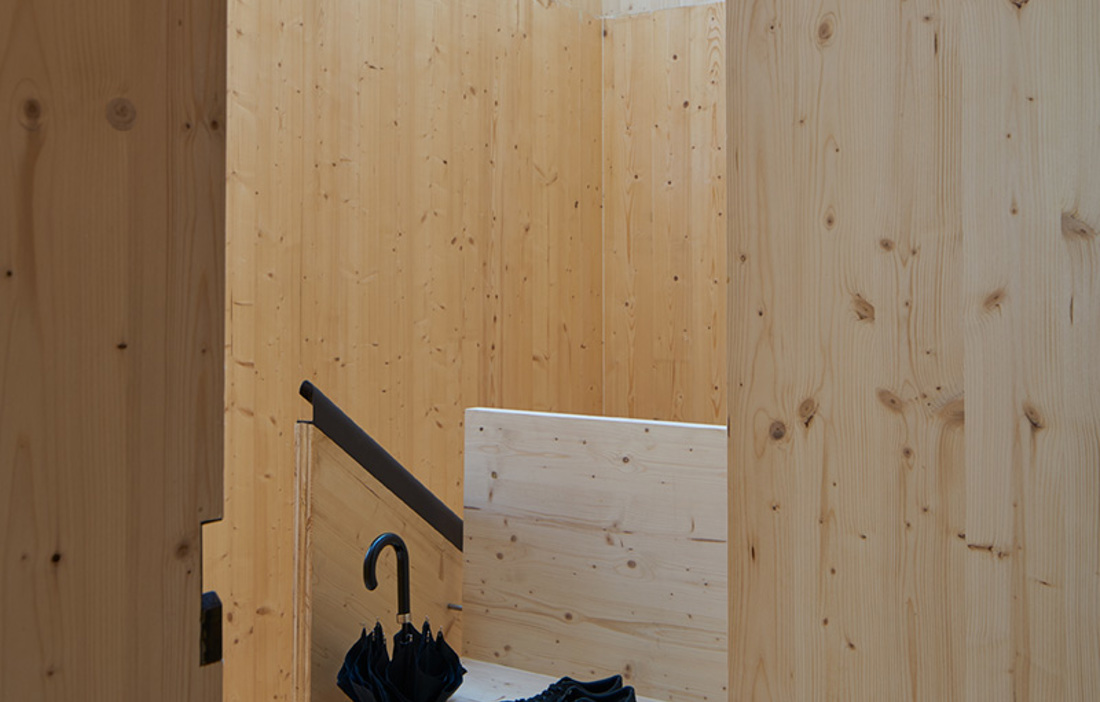 Invändigt får träet ta för sig desto mer. Här har träkonstruktionen lämnats fullt synlig och materialet har fått möjlighet att komma till sin fulla rätt hela vägen från golv till tak, inte bara konstruktionsmässigt utan även ur ett visuellt och estetiskt perspektiv. Det är bara i de sex lägenheternas badrum och i husets källarvåning som det brunröda fasadteglet återigen gör sig påmint.