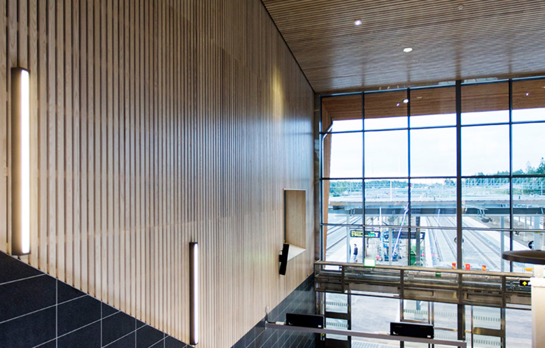 Arkitektfirman &Rundquist har ritat den nya stationsbyggnaden och den anslutande bron. Stationens entré är tydligt framträdande där träet möter bron i