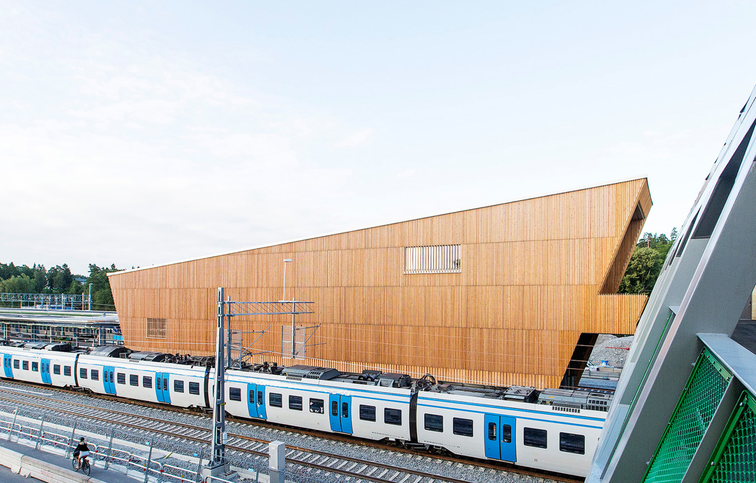Kallhälls nya pendeltågsstation lyser trävarmt i solen. Stationsbyggnaden består av två generösa volymer med en tydlig riktning längs med spåret. De är uppbyggda av en nedre betongdel och en övre stålstruktur, klädda med en djupt profilerad panel av sibirisk lärk som skapar en levande yta när ljuset spelar över den.