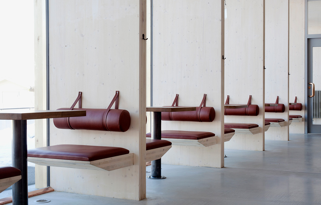 Interiört bildar de stående KL-träskivorna både stomme och avdelare mellan sittplatserna. Sittytan, även den av KL-trä, är snyggt infäst direkt i stommen. På ena gaveln av restaurangen skapar ett stort fönster utsikt över dagbrottet Stora Stöten.