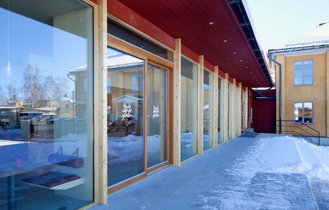 – Jag ville göra en nutida träbyggnad, som ändå samverkar med den historiska platsen, genom att arbeta med en synlig stomme helt i korslimmat trä. De rytmiskt ställda KL-träskivorna i fasaden leder in dagsljuset, och i övergången mellan ute och inne bildas en uteplats under tak, berättar arkitekt Hans Murman.