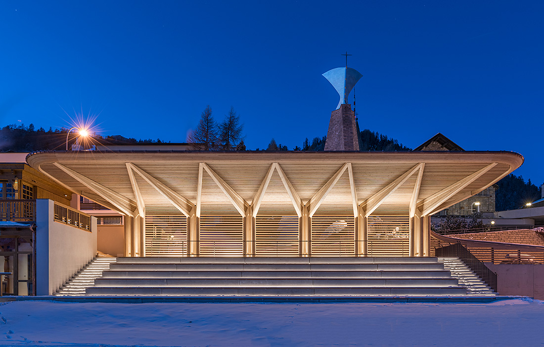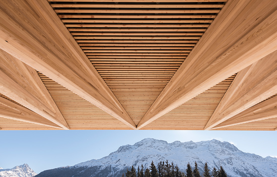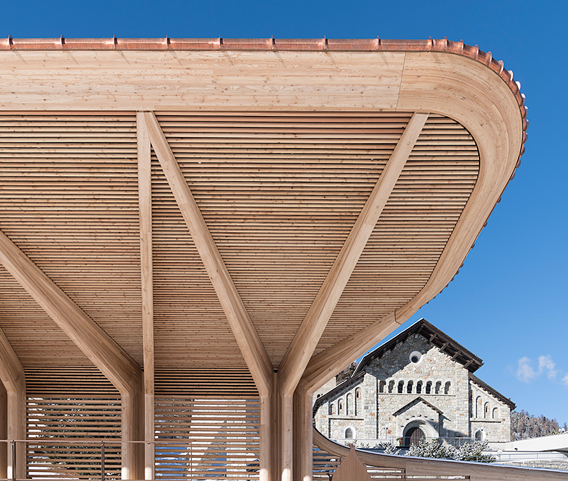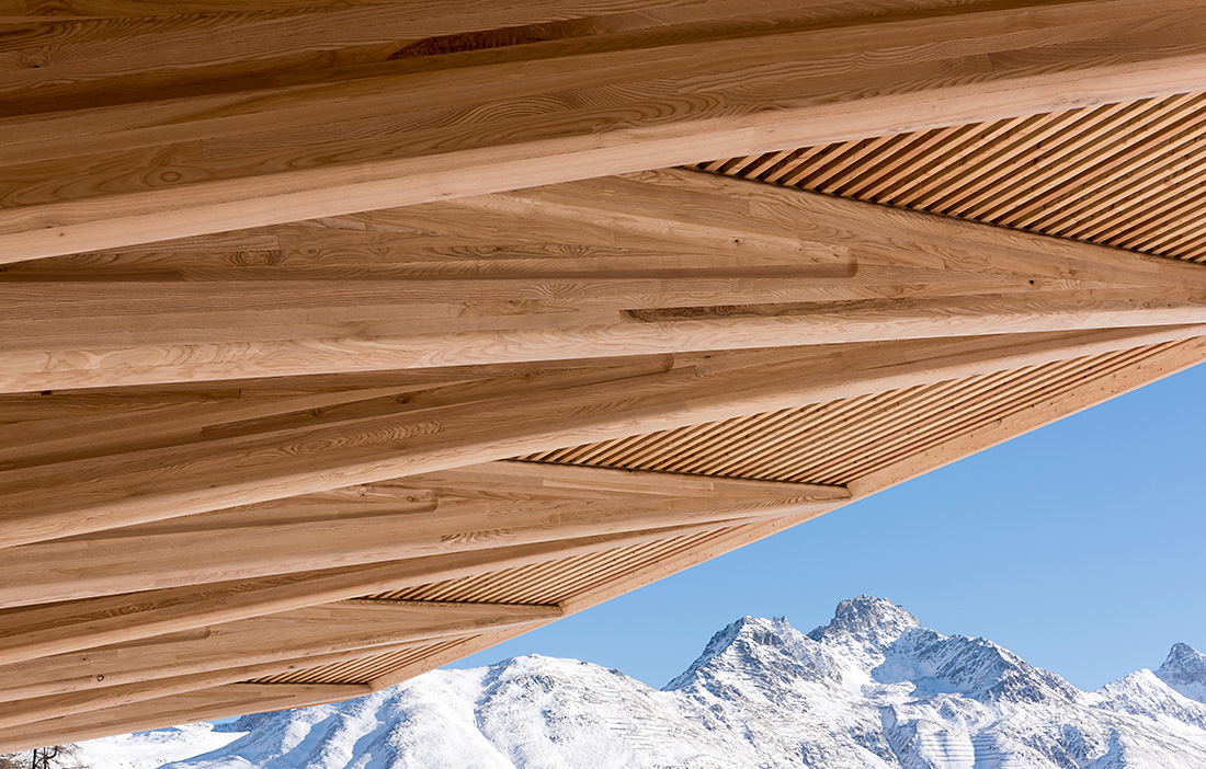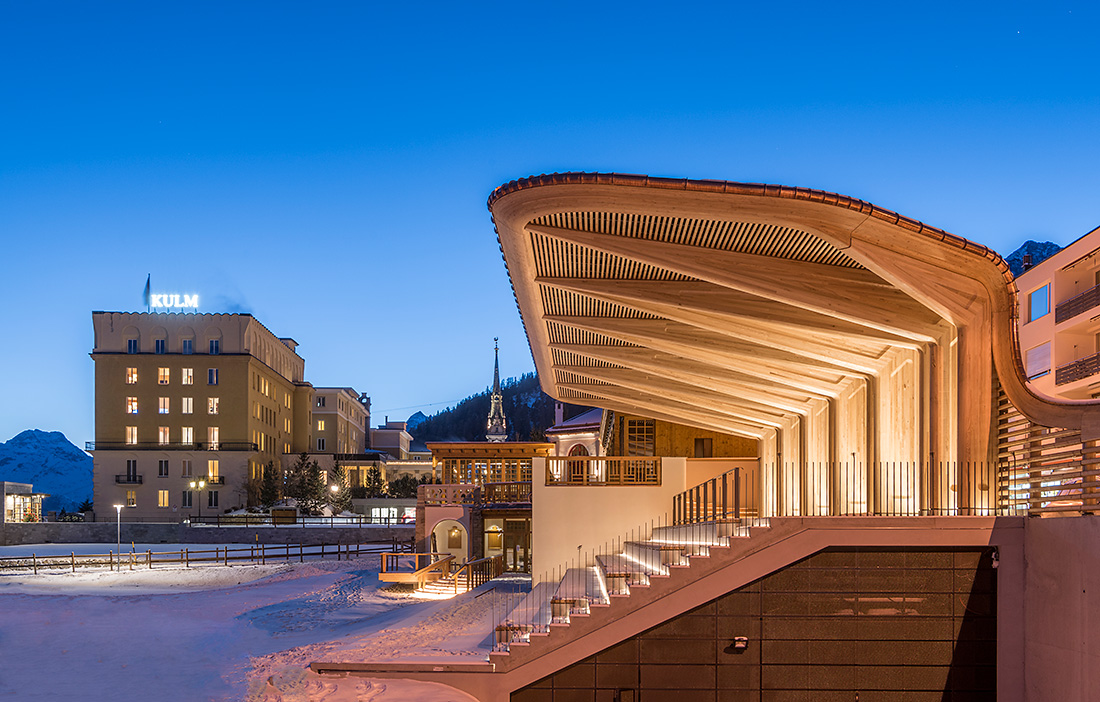 I samband med en omfattande renovering av den historiska ispaviljongen i Sankt Moritz har Foster + Partners skapat en ny ministadion, eller en tribun. Bland annat användes den för prisutdelningen under världscupen i slalom. Den sträcker sig längs kanten av Davos Plaun och formar ett hörn med en mindre struktur i 45 graders vinkel som fungerar både som sol- och vindskydd och som samtidigt bjuder på en vy över bergen.